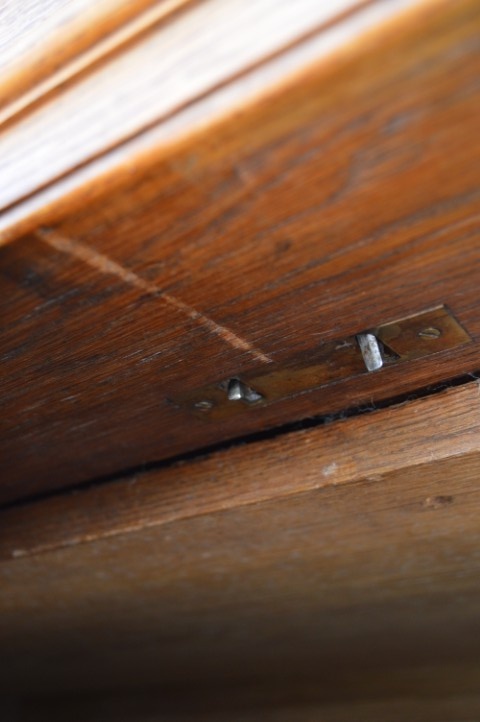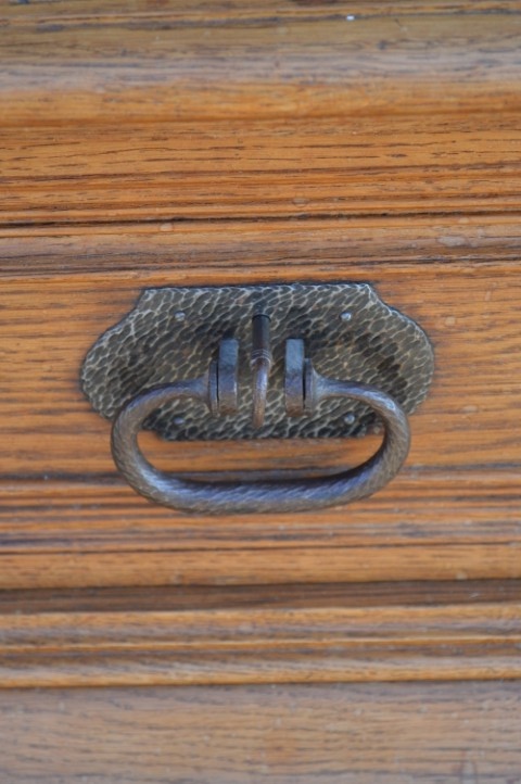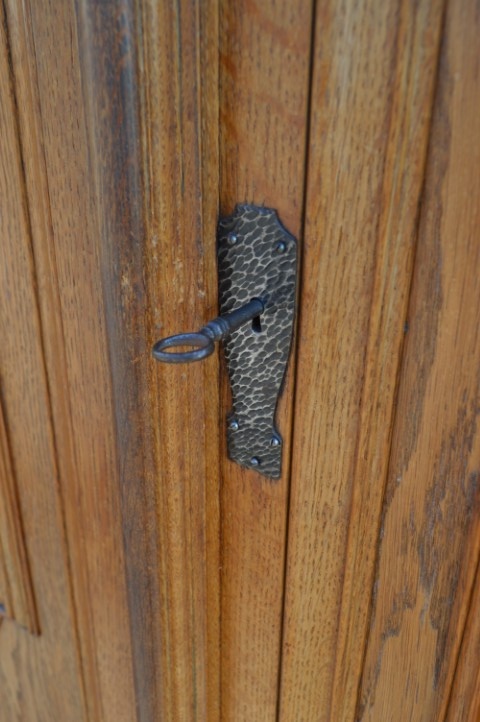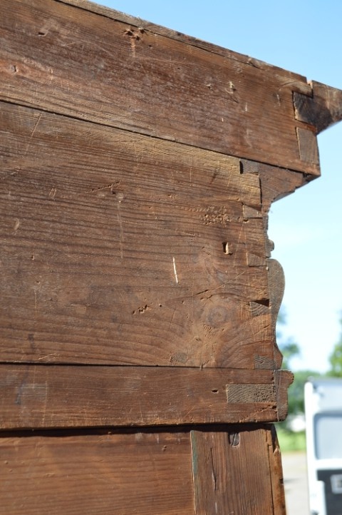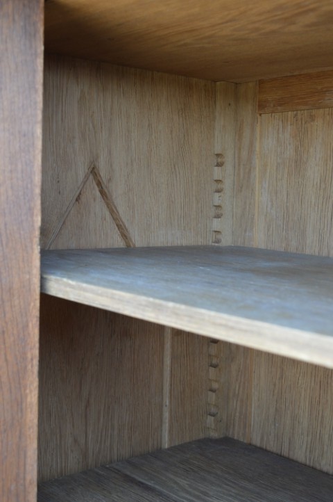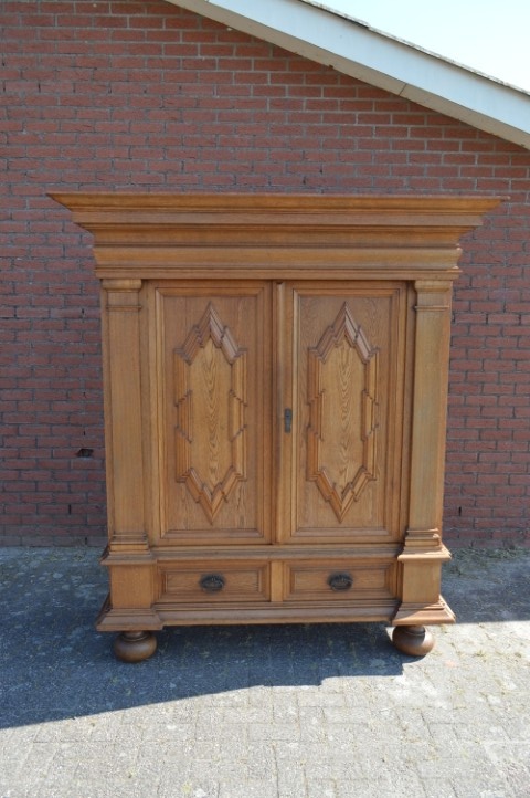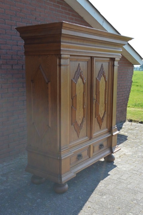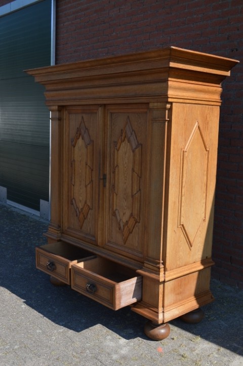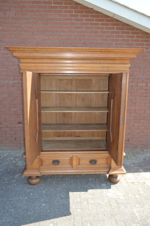 Robuuste brocante wandkast is grotendeels gemaakt van grenenhout en deels massief eiken. De kast heeft met eiken opgelegde paneeldeuren en zijkanten. De twee laden onderin zijn voorzien van metalen handgrepen, de deuren zijn uitgerust met slotwerk. De binnenkant van de kast heeft drie in hoogte versctelbare planken waardoor hij ook uitstekend te gebruiken is als linnenkast, servieskast of dichte boekenkast. Deze bijzondere kast is origineel en gedeeltelijk demontabel.