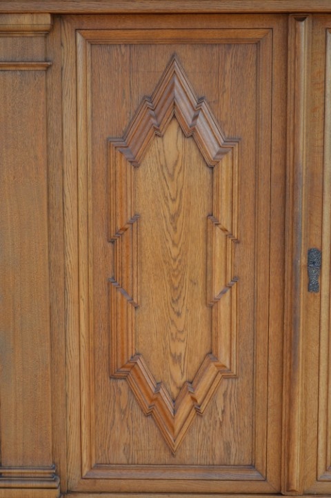 Het is een tweedehands gebruikte degelijke kast met gebruikssporen. Als de kast gedemonteerd is bestaat het uit het lade gedeelte, deuren gedeelte, planken en de kap.