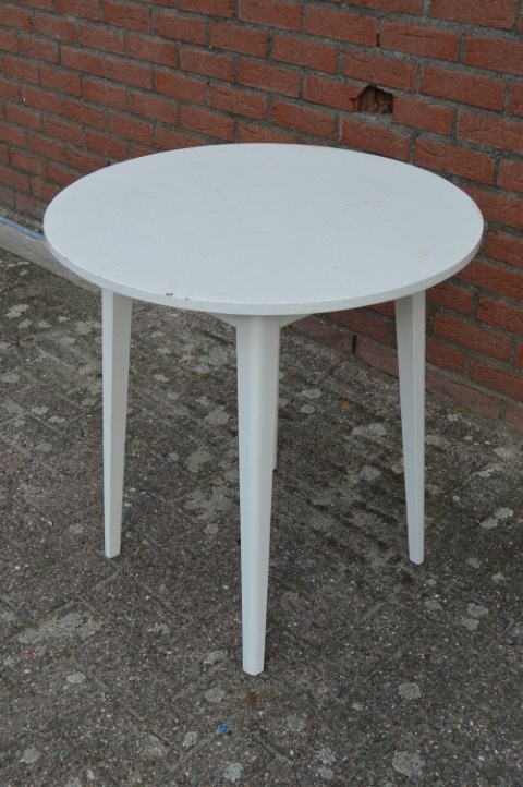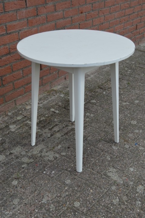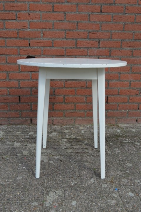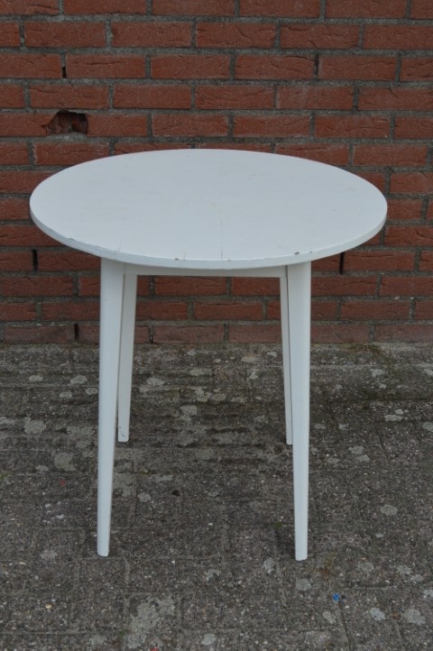 Het tafeltje heeft een gefineerd blad, een massief houten onderstel en is wit geschilderd door de vorige eigenaar. Ideaal als klein eettafeltje, bijzettafel naast de bank of als pedestal voor een plant of vaas. De gebruikssporen geven dit vintage tafeltje juist extra charme en karakter maar het kan u natuurlijk ook aanzetten tot het opnieuw schilderen van deze kleine tafel.