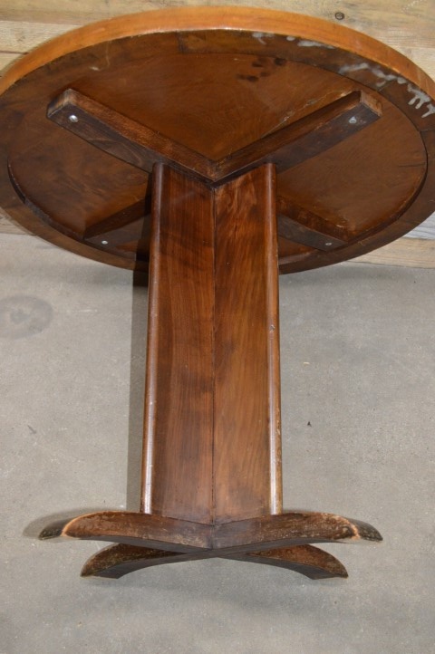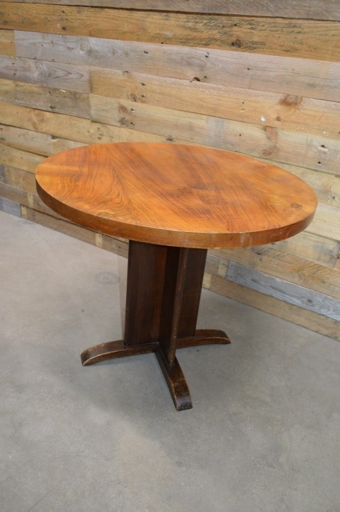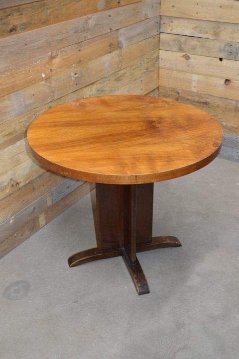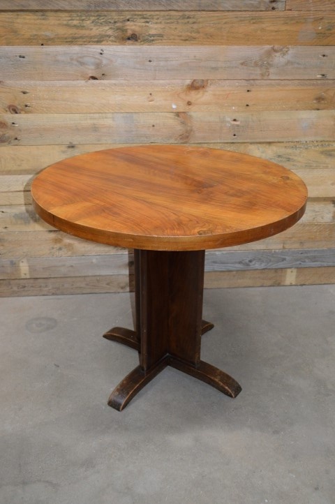 Rond houten bijzet- of accenttafel in de stijl van Art Deco. Het strakke kruisvormige donkere onderstel en poten met zwaar lichtkleurige tafelblad geven dit salontafeltje een verfijnde en moderne uitstraling.