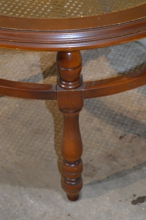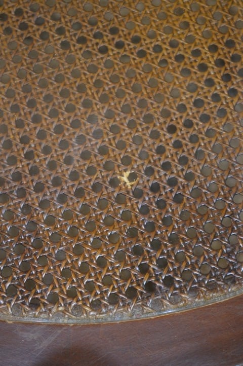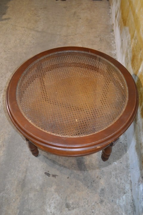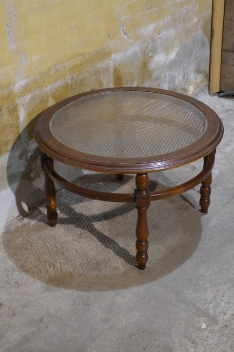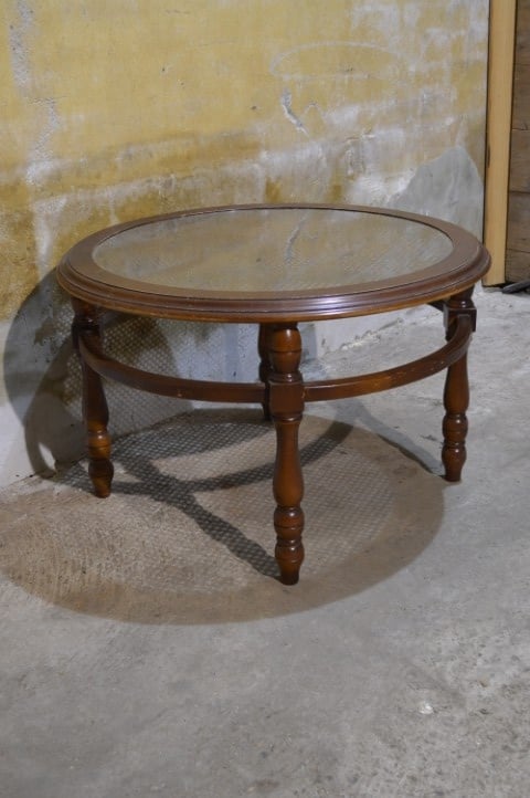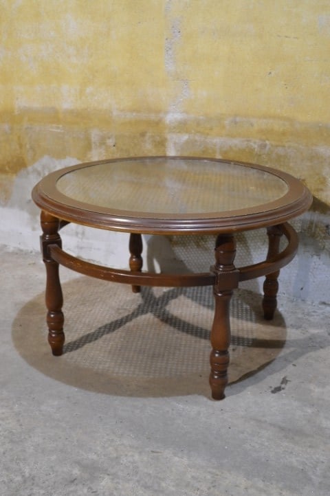 Deze ronde salontafel van notenhout met glazen blad en rotan webbing heeft een warme en klassieke uitstraling. De tafel staat op een stevig houten onderstel en is voorzien van een glazen blad, waaronder een decoratieve rotan webbing zichtbaar is. Dit geeft het geheel een luchtig en stijlvol karakter. Ideaal voor gebruik in de woonkamer om drankjes, hapjes of decoratie op te plaatsen. De tafel is gebruikt en verkeert in goede staat met lichte gebruikssporen die passen bij de leeftijd.