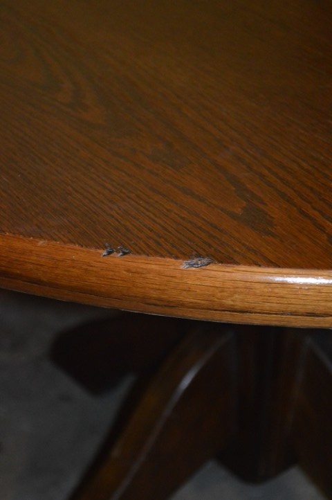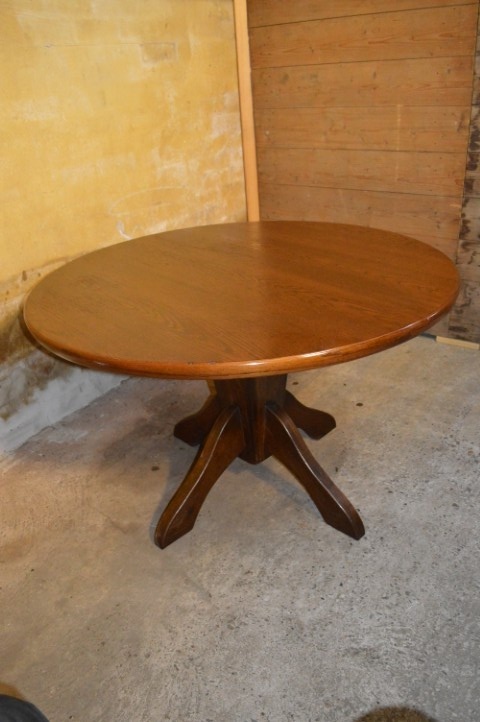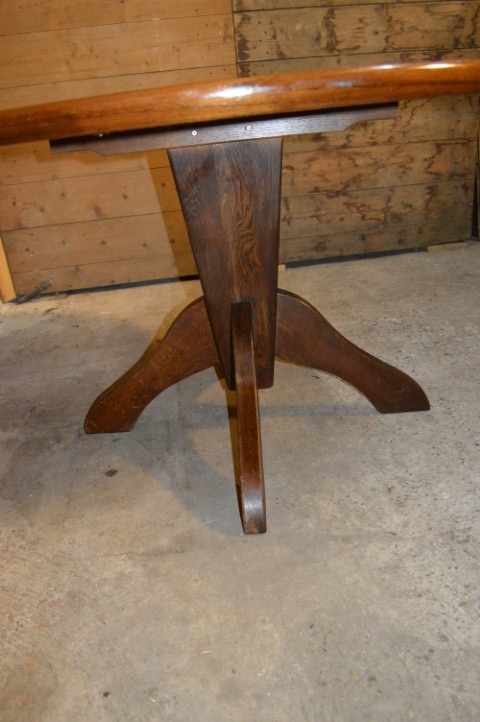 Het ronde blad toont een prachtige houtnerf en heeft vloeiende randen, waardoor de tafel geschikt is voor zowel informele diners als formele momenten. De stevige middenvoet met vier zijpoten zorgt voor optimale stabiliteit en een verfijnde mid-century uitstraling. De tafel verkeert in gebruikte staat met zichtbare gebruikssporen, zoals krasjes en kleine deukjes in het blad, passend bij de leeftijd.