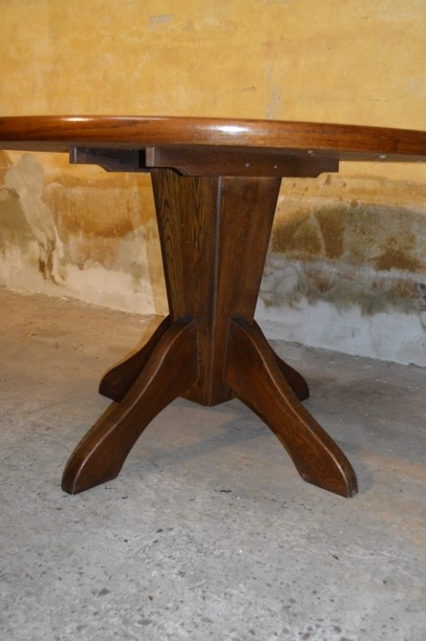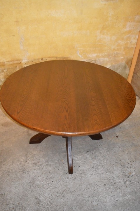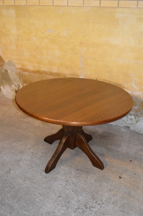 Deze ronde vintage eettafel van massief eikenhout uit de jaren 60 is een elegante blikvanger met karakter.