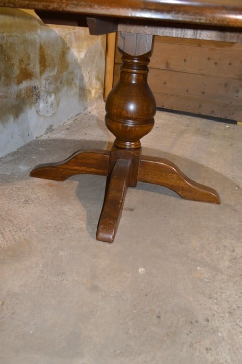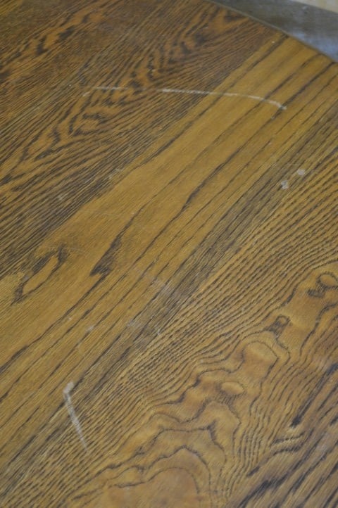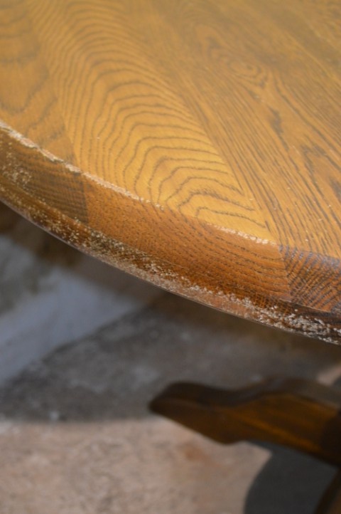 De tafel vertoont gebruikssporen en lakschade op het blad, wat past bij het gebruik en bijdraagt aan het karakter van het meubel.