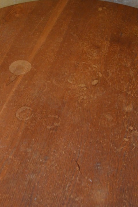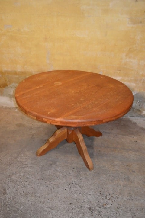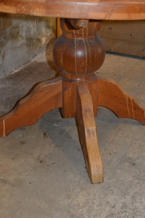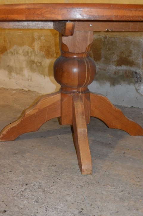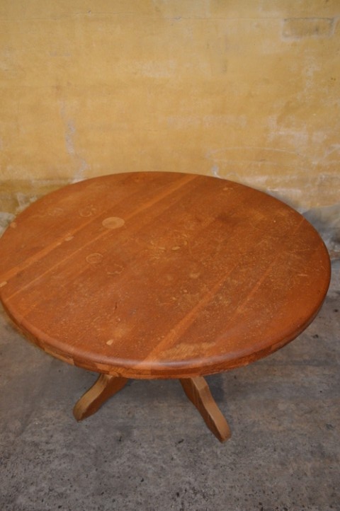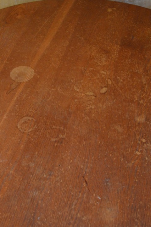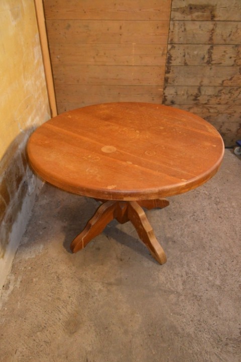 De tafel dateert uit de jaren 80 en is volledig uitgevoerd in massief eikenhout. Er zijn gebruikssporen aanwezig en het blad kan opnieuw gelakt worden om hem weer in topconditie te brengen. Een ideale basis voor wie een degelijke houten tafel zoekt met karakter én potentie.