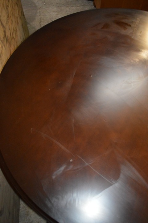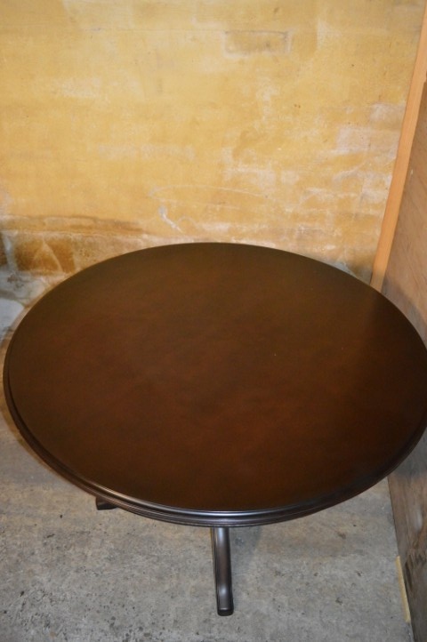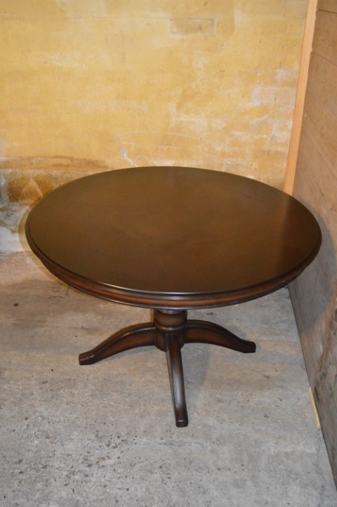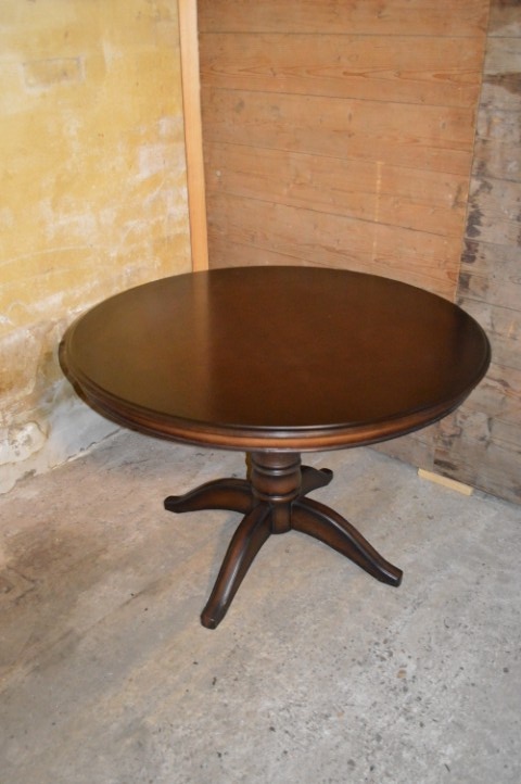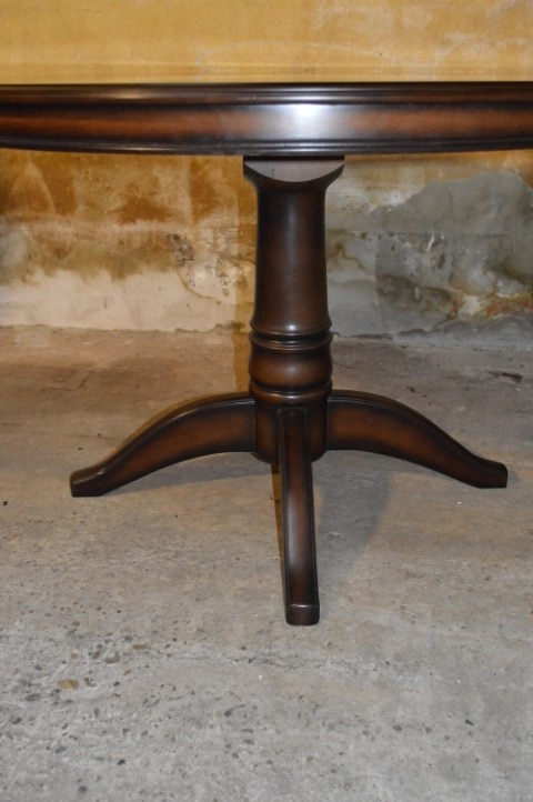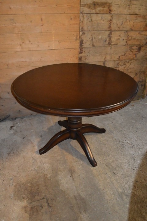 De tafel is uitgevoerd als kolomtafel met vier zijpoten, wat zorgt voor een stabiele tafel met een solide constructie. Met een doorsnede van 115 cm is het blad groter dan gebruikelijk en biedt het comfortabel plaats aan 6 personen. De tafel verkeert in goede staat met enkele gebruikssporen, zoals kleine deukjes en krasjes op het blad, passend bij de leeftijd.