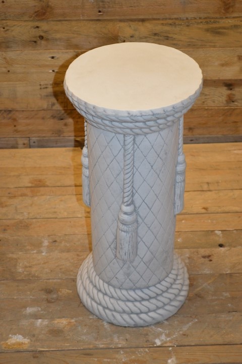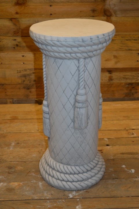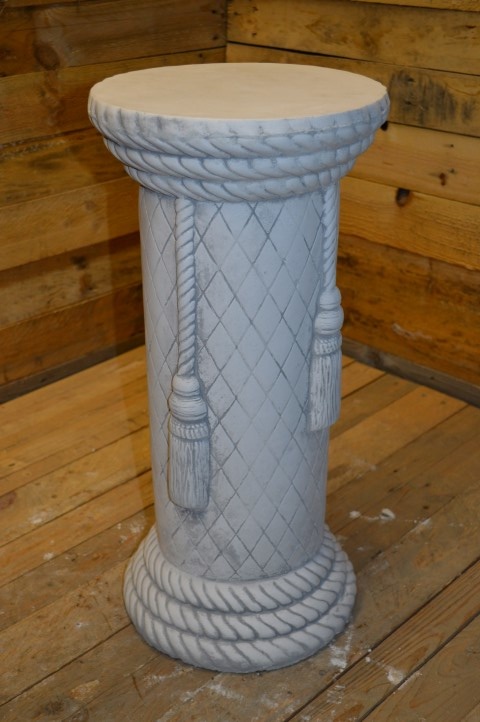 Deze ronde betonnen pilaar met een decoratief koord en kwastjes is een stijlvolle sokkel die zowel binnen als buiten tot zijn recht komt. Het beeld is volledig uit gietsteen (beton) gegoten en heeft een klassieke uitstraling met subtiele details. Ideaal om een grote vaas, een sierlijk beeld of een groene plant op te plaatsen. In de tuin zorgt het voor hoogte en elegantie, terwijl het binnen – bijvoorbeeld in de hal of serre – perfect combineert met een mooie kamerplant of sculptuur.