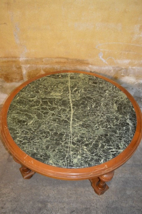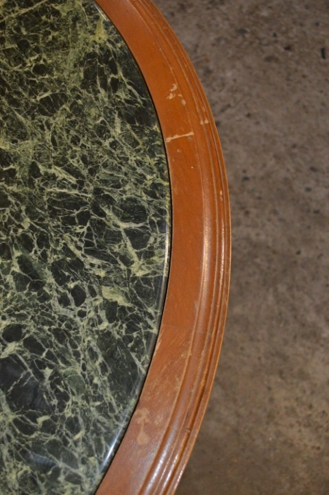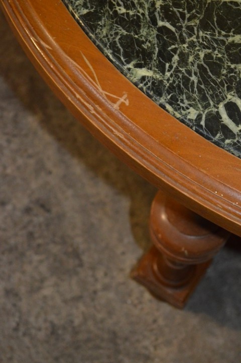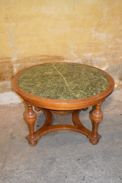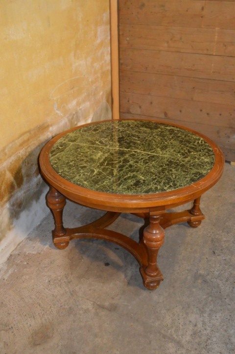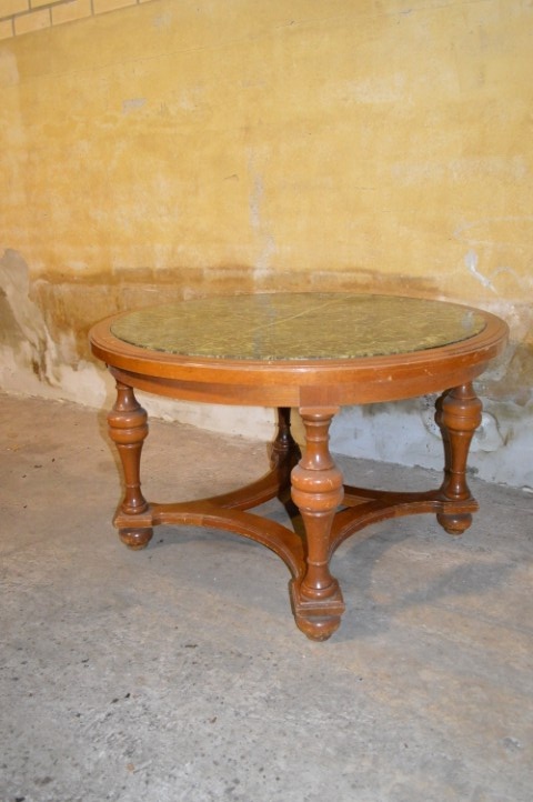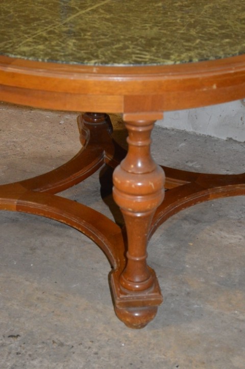Deze vintage design ronde salontafel met natuurstenen blad dateert uit eind jaren 50 en is een prachtig voorbeeld van elegant naoorlogs design. De tafel staat op vier mooi gedraaide houten poten die met dwarslatten verbonden zijn en samen een ruitvormige constructie vormen in het midden. Het blad bestaat uit natuursteen met een schitterend groen-wit gemarmerd patroon en ligt verzonken in een houten ring die de rand van het blad vormt. Dit geeft de tafel een warme uitstraling en zorgt tegelijk voor een verfijnde afwerking.