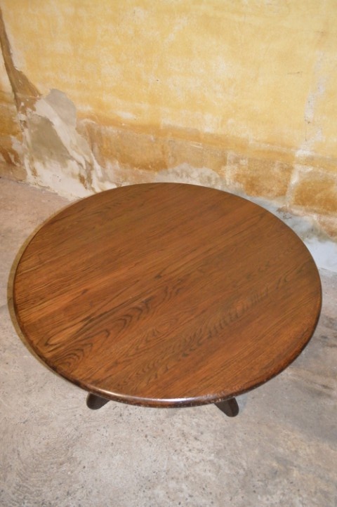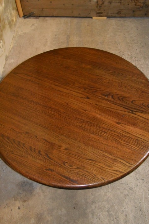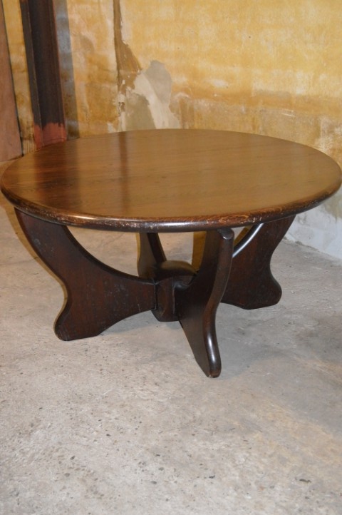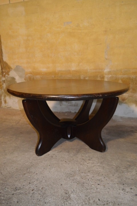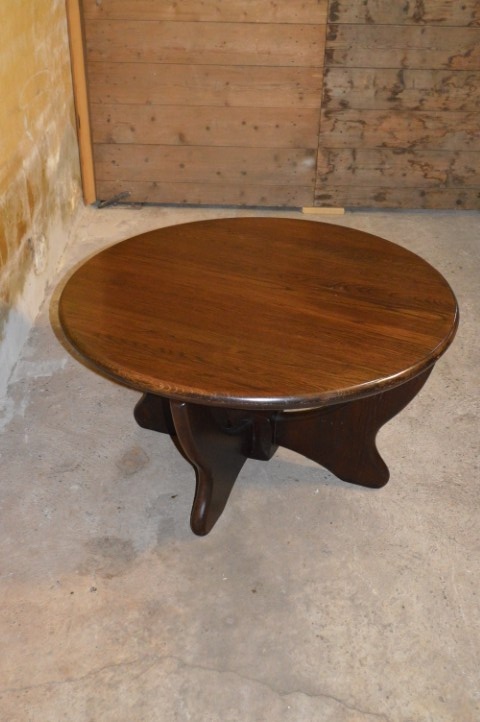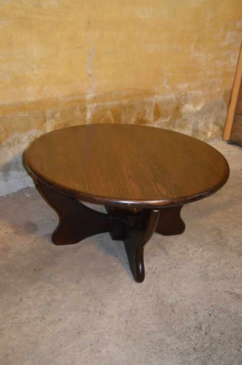 Ronde eikenhouten salontafel met een Yugo-onderstel, afgewerkt in een rijke, donkerbruine semi-glanzende kleur. Het meubel straalt een authentieke, verweerde charme uit en vormt een elegant middelpunt in elke woonkamer.