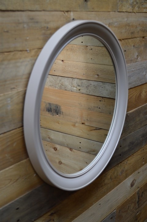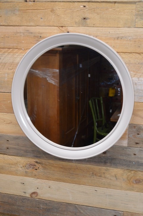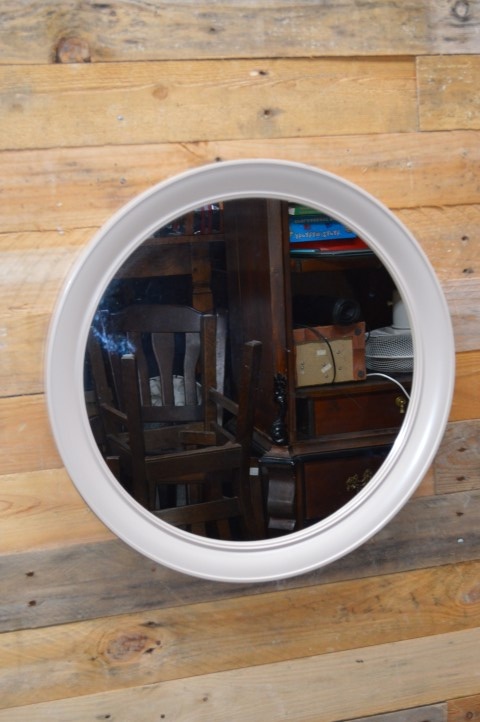 Retro Spiegel in een witte lijst. De wand spiegel van rond 1970. De witte lijst is gemaakt van kunststof. Vintage muur decoratie zowel voor in de badkamer als in de hal.
