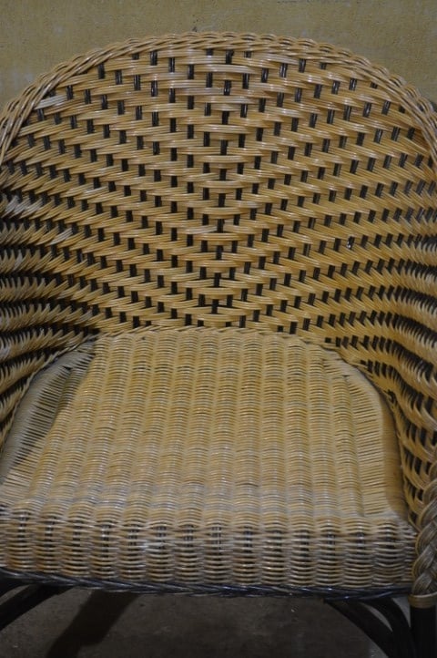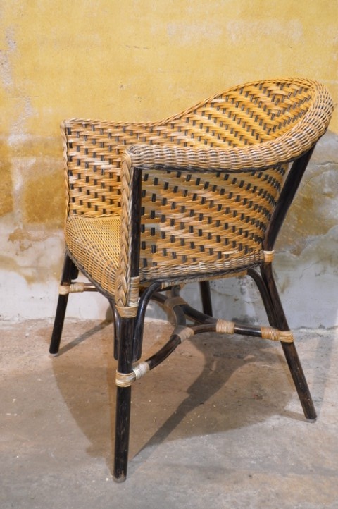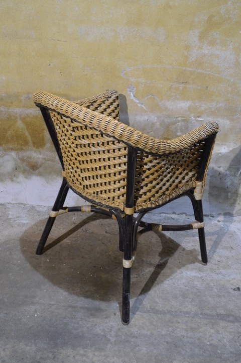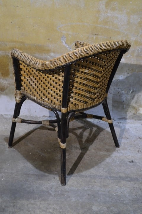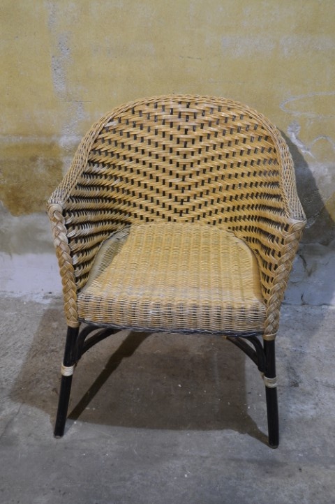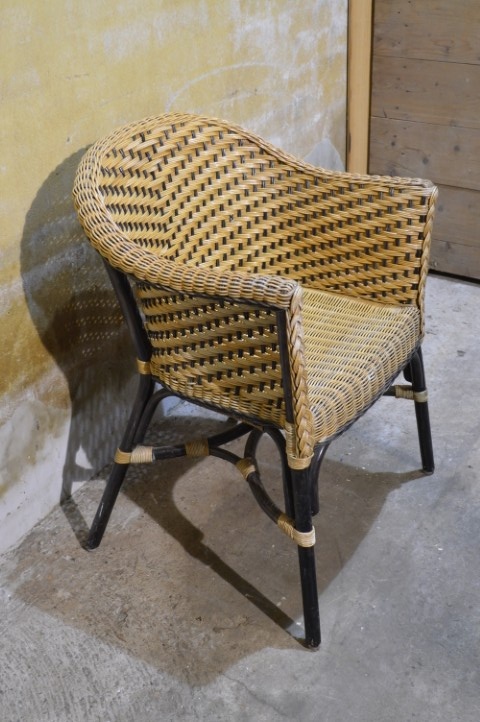 Tweedehands Taveerne rotan armstoel met metalen onderstel en twee kleuren. Deze lichte en praktische stoel is ideaal voor terras, balkon of binnengebruik. Het rotan zit- en rugvlak geeft een natuurlijke uitstraling, terwijl het metalen onderstel stevigheid biedt. De stoel vertoont gebruikssporen passend bij de leeftijd, maar is functioneel en decoratief.