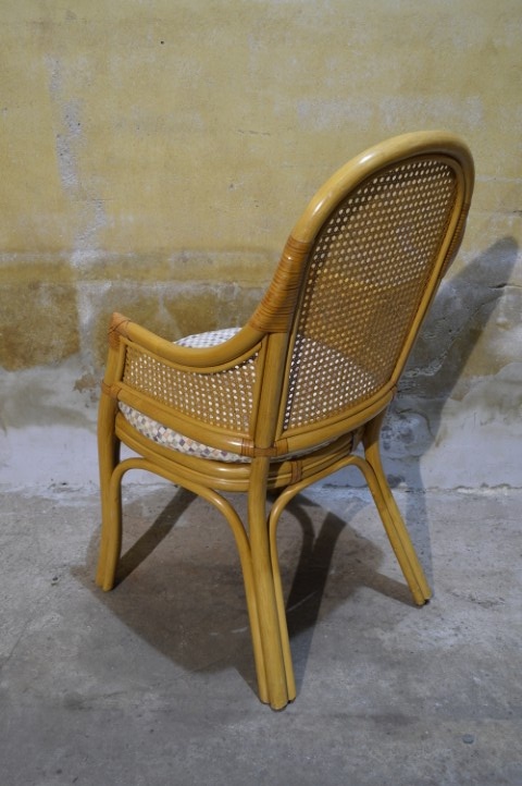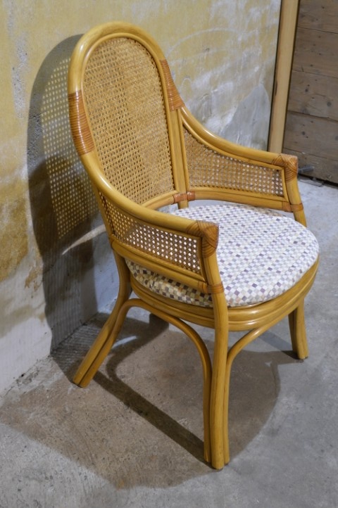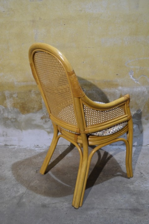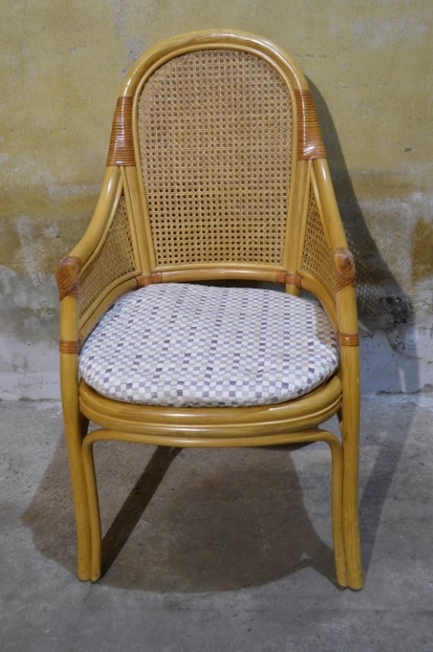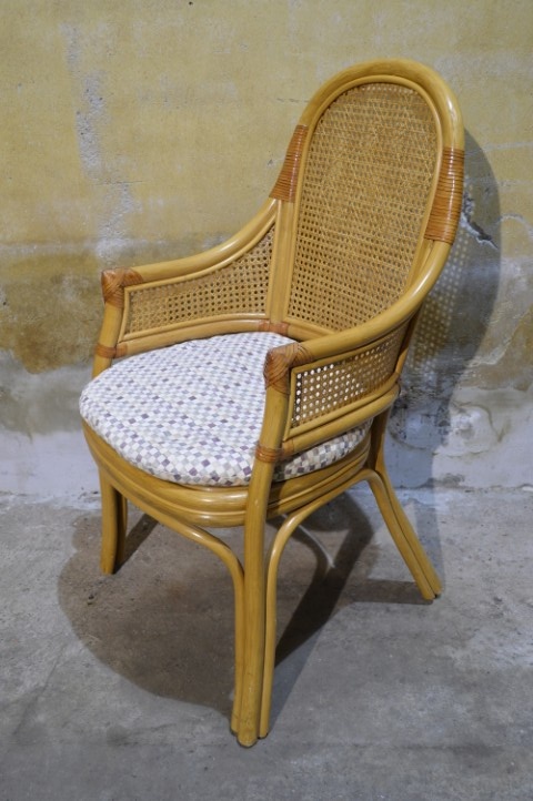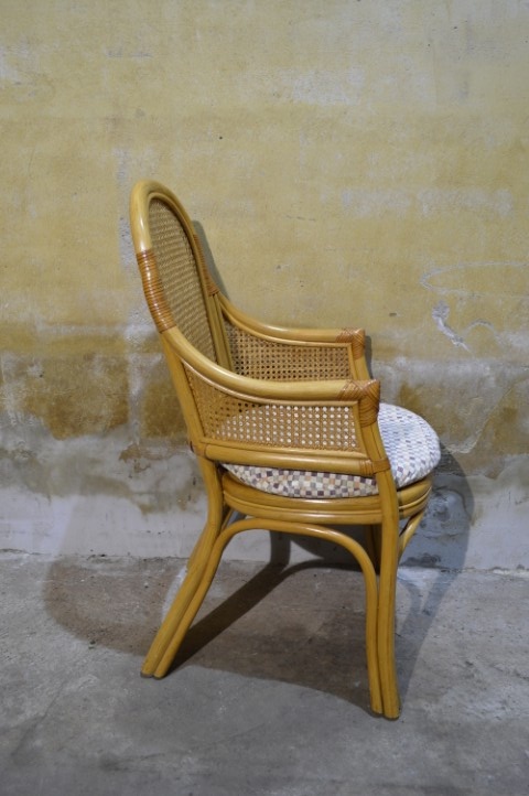 Luchtig en stijlvol! Rotan armstoel jaren 80 is een karaktervolle vintage stoel met een open webbing uitstraling. Deze stoel is ideaal als eetkamerstoel of als losse fauteuil in de woonkamer, hal of slaapkamer. De natuurlijke rotan look zorgt voor een warme en ontspannen sfeer en past perfect binnen een bohemian, vintage of landelijk interieur. De stoel heeft gebruikssporen passend bij de leeftijd.