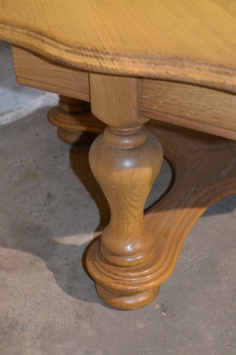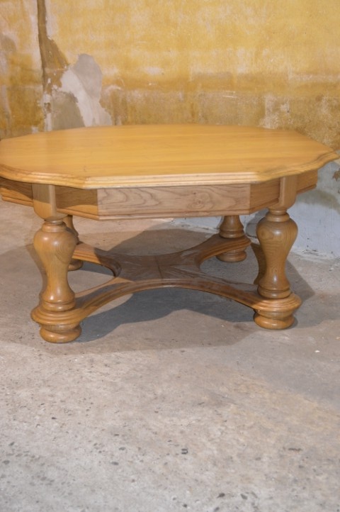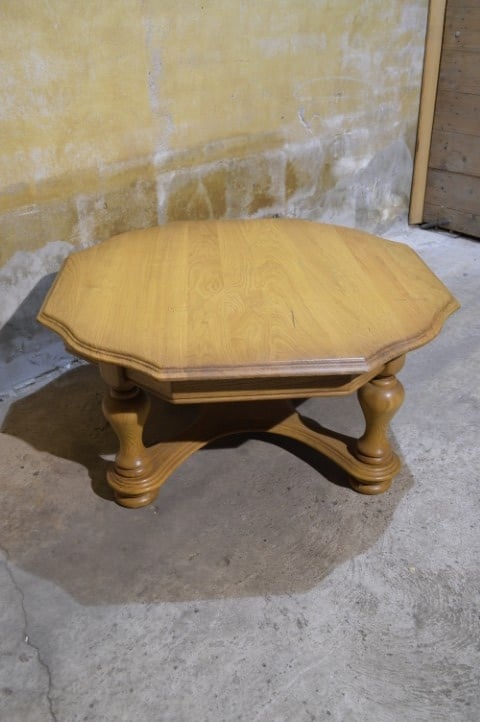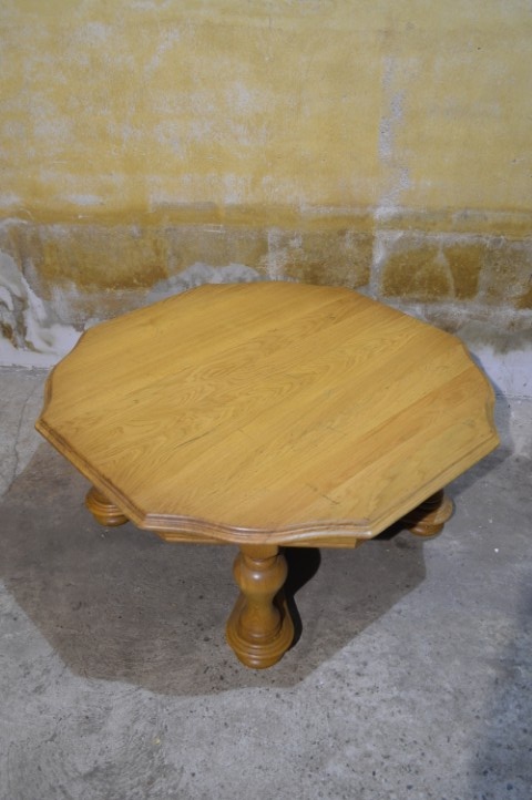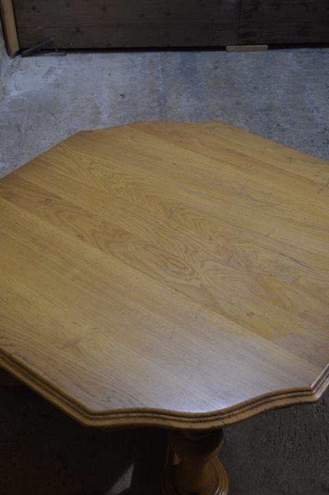 Deze ronde massief eiken salontafel uit circa 1970 combineert een elegante uitstraling met een stevige constructie. Het ronde blad met randschubben en de kolom poten geven de tafel een tijdloos en warm karakter. De tafel is uitgevoerd in massief blank eikenhout en voelt solide en duurzaam aan. De tafel verkeert in goede staat en vertoont enkele krassen op het blad en gebruikssporen passend bij de leeftijd.