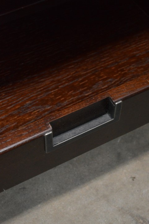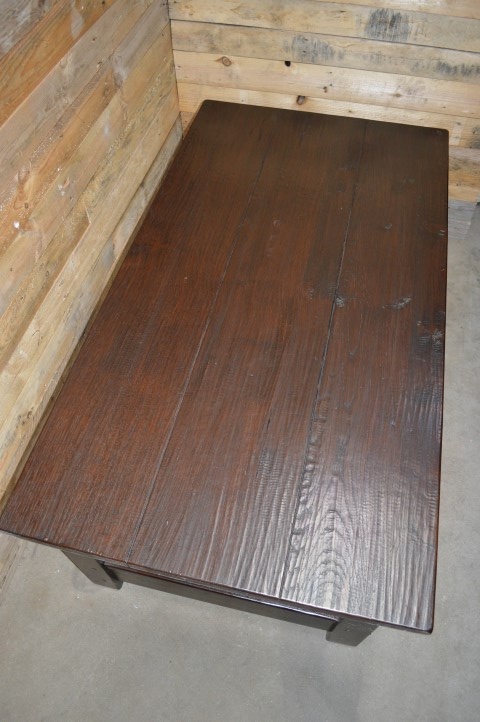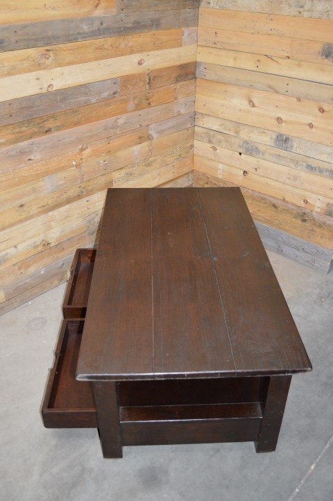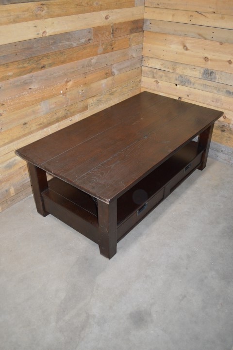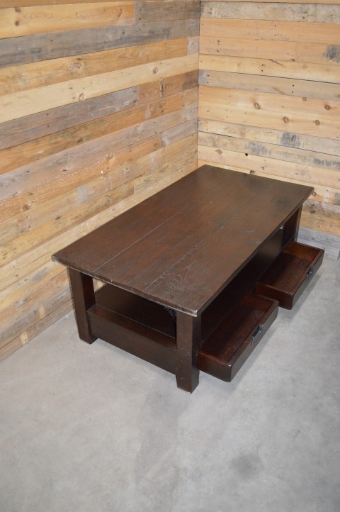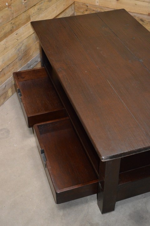 Grote rechthoekige massief donker eiken salontafel met lectuur plank en twee lades daaronder. Een mooie robuuste tafel met een ruim blad waar ook kinderen veilig omheen kunnen zitten.