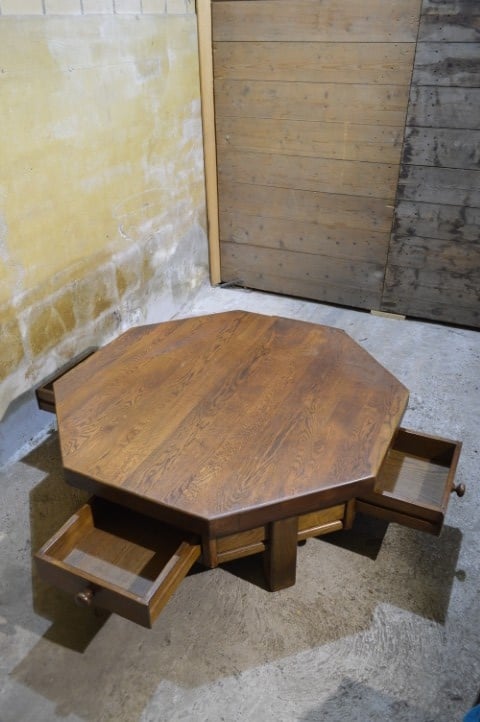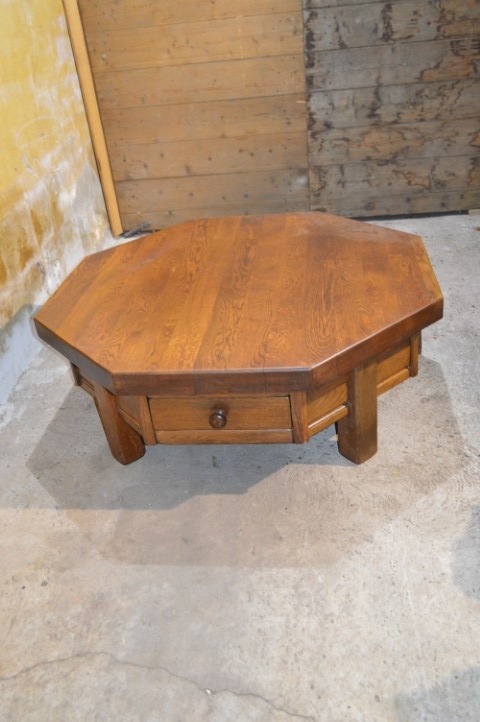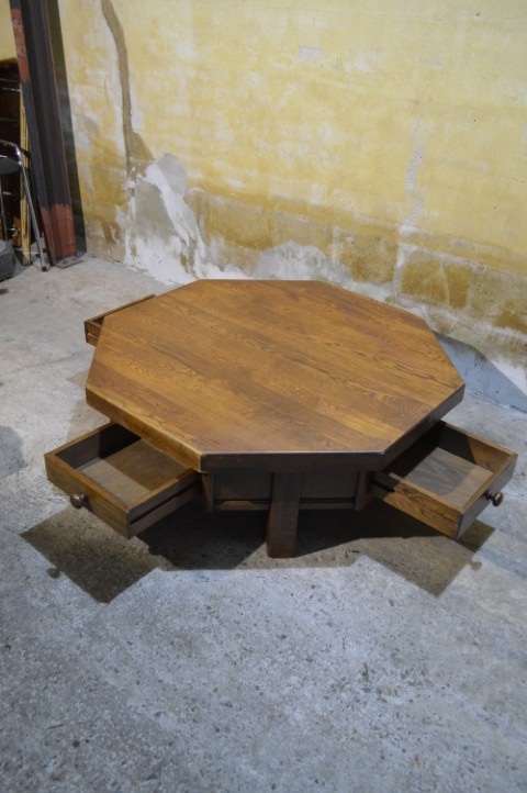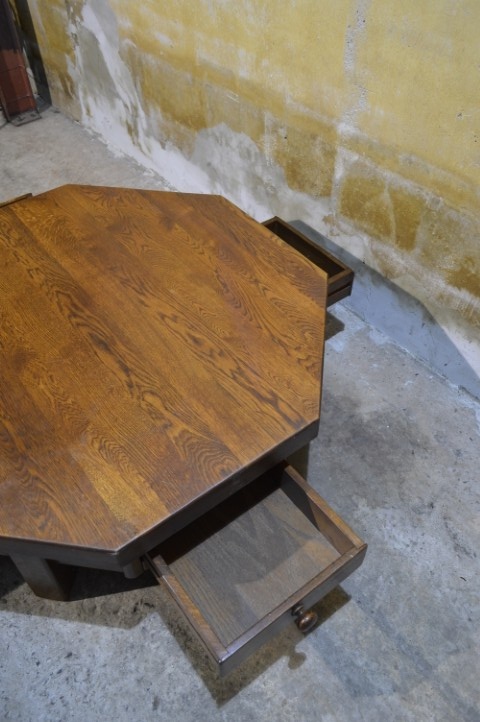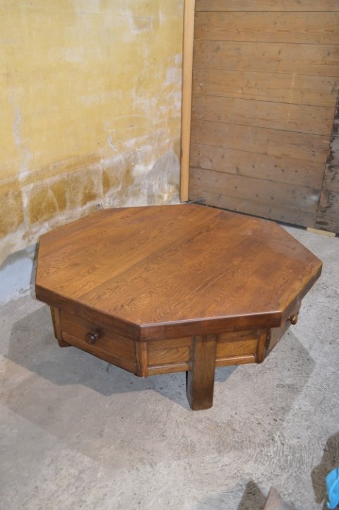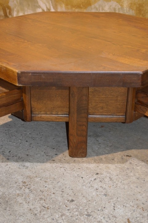 Deze achtzijdige eiken salontafel met laden is een karaktervol en praktisch meubelstuk met een warme vintage uitstraling. De tafel is vervaardigd uit massief eikenhout en heeft een opvallende achtzijdige vorm, wat zorgt voor een speels en uniek geheel. De salontafel is voorzien van vier laden, waardoor er voldoende opbergruimte is voor bijvoorbeeld tijdschriften, afstandsbedieningen of andere kleine spullen. Dit maakt de tafel niet alleen stijlvol, maar ook functioneel in dagelijks gebruik. De tafel verkeert in nette staat met weinig gebruikssporen, wat bijdraagt aan de charme zonder afbreuk te doen aan de uitstraling. Een robuuste en sfeervolle salontafel die perfect past in een landelijk, klassiek of vintage interieur.