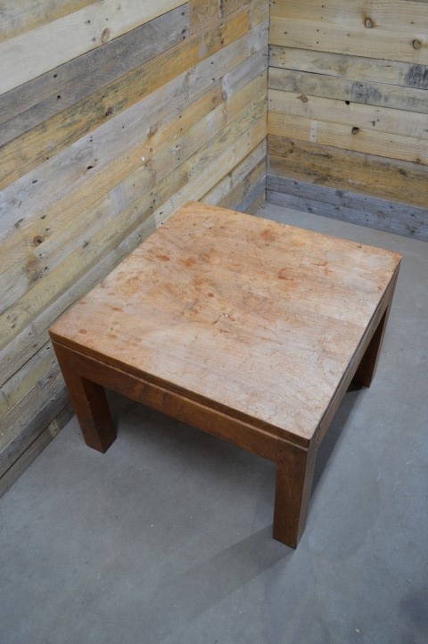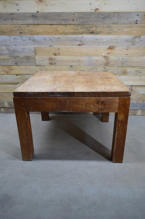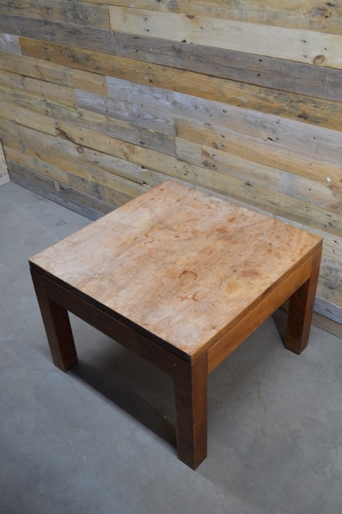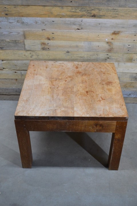 Het tafeltje heeft wel wat gebruikssporen opgelopen zoals wat vlekken op het blad, maar is in goede tweedehands staat en zal nog jaren meegaan als mooie vierkante hoektafel.