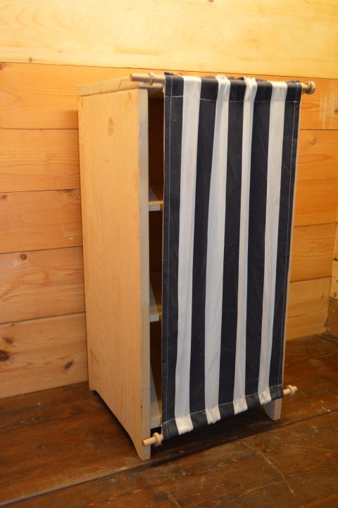 Dit kleine schappen kastje van vurenhout is voorzien van een charmant gordijntje en biedt praktische opbergruimte.