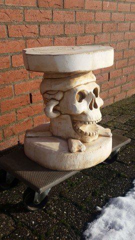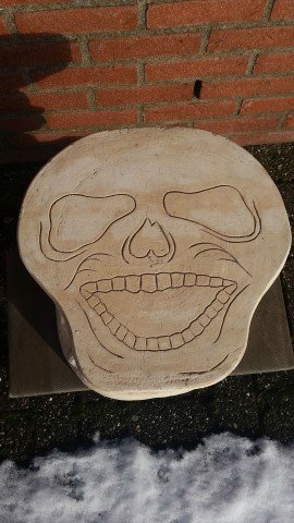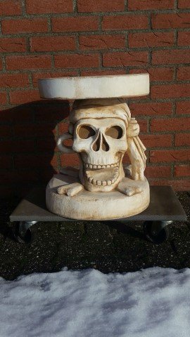 De massief betonnen bijzettafel in de vorm van een schedel is een stoere blikvanger voor binnen en buiten. Het tafelblad bevat een tweede schedel, wat het ontwerp extra artistiek maakt. Ook geschikt als decoratief beeld of sokkel.