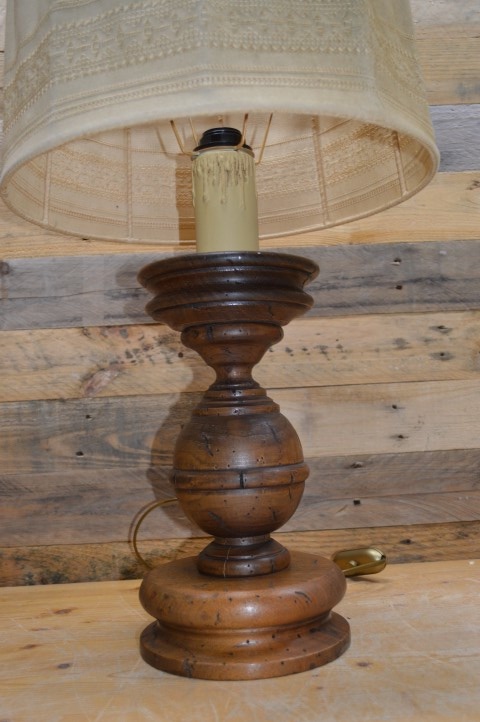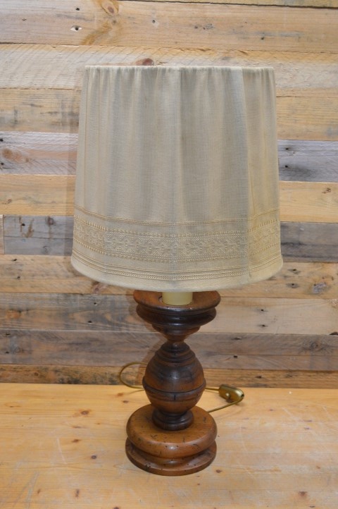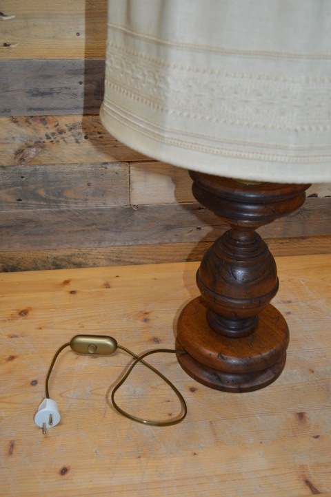 Deze ouderwetse houten schemerlamp met geborduurde stoffen kap is mooi om te zien en geeft veel sfeer in huis als de nachten weer wat langer worden. De lamp is bij uitstek geschikt om op een kast, tafel of in de vensterbank te zetten. Leuk om nog even wat bij te lezen of gewoon als sfeerlicht bij het televisiekijken. De lamp heeft wat gebruikssporen maar is verder nog in goede staat.