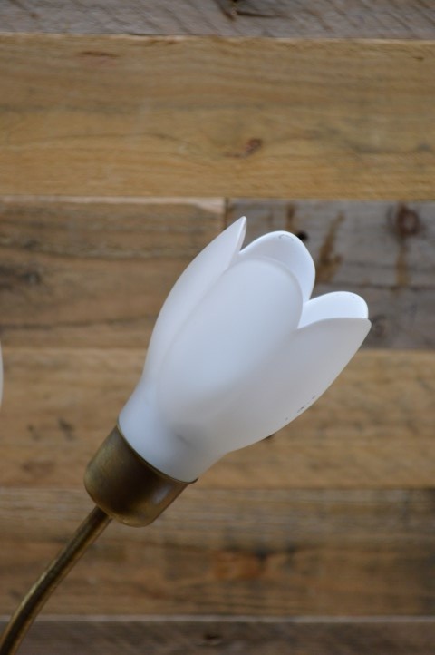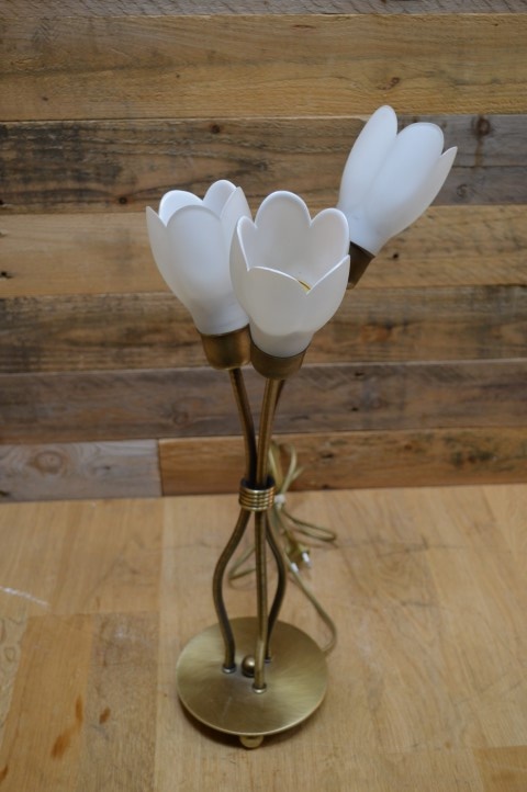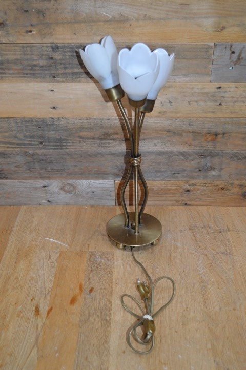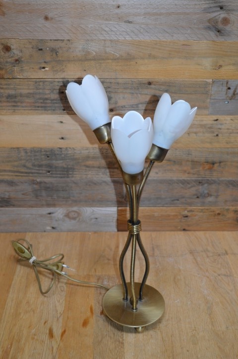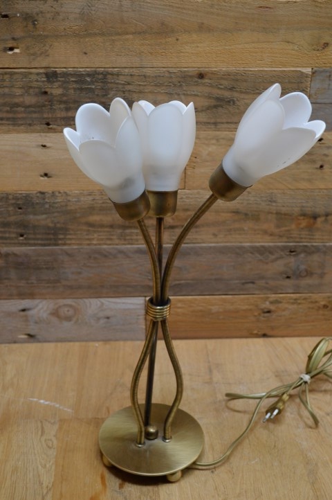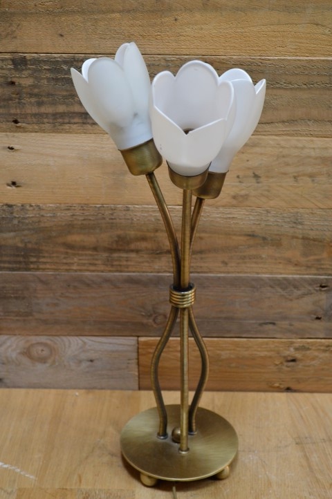 Decoratief messing kleurig schemerlampje met 3 bloemvormige lampenkapjes van wit glas. Ideaal als sfeerverlichting en decoratie op een dressoir maar ook erg leuk om bijvoorbeeld op een nachtkastje of bureau als leeslampje te gebruiken . Deze prachtige tafellamp is dankzij het opvallende ontwerp een echte blikvanger die op iedere kast, bijzettafel en vensterbank goede sfeerverlichting geeft.