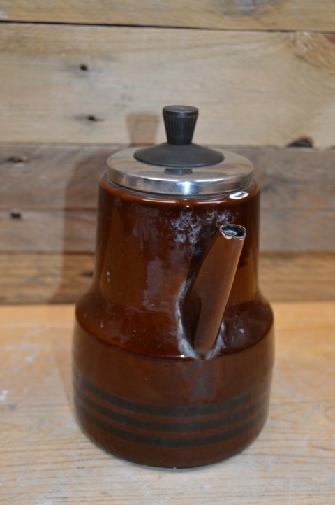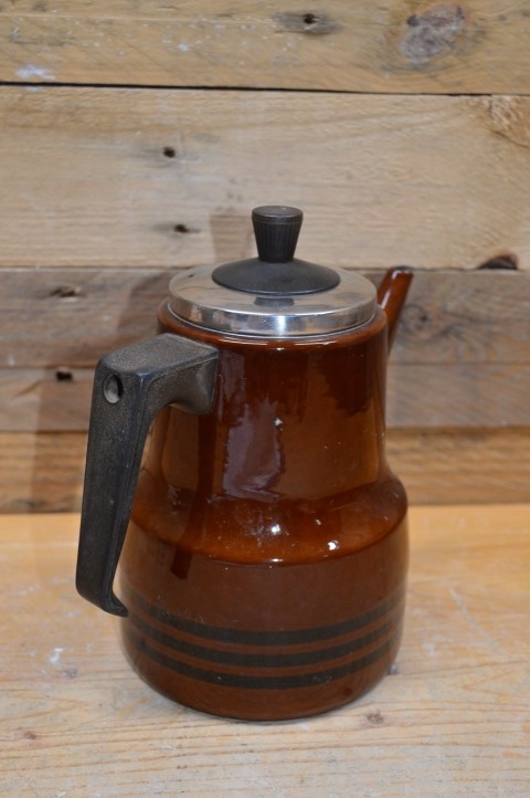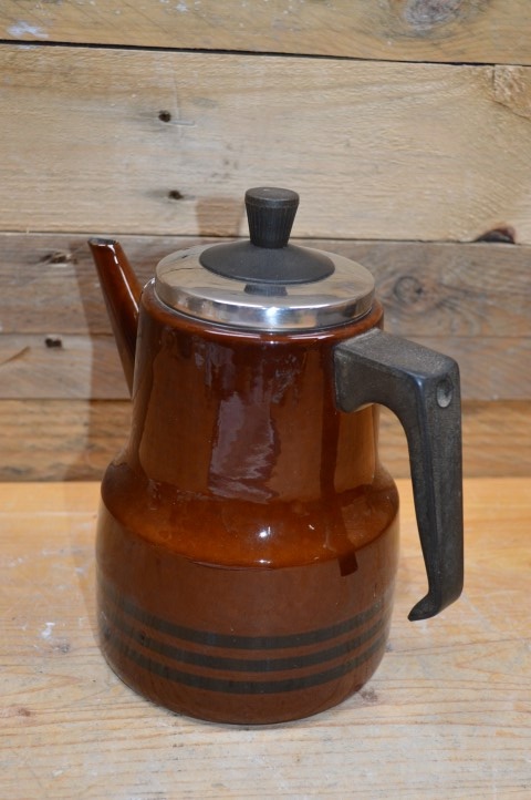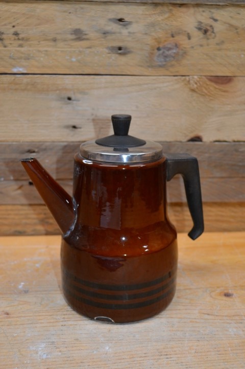 Deze mooie schenkkan van donkerrood emaille met zwarte accenten en kunststof handgrepen werd vroeger vaak voor de koffie en thee gebruikt, maar tegenwoordig kan deze geëmailleerde schenkkan ook heel goed gebruikt worden als decoratie op de kachel of om bijvoorbeeld een bloemetje in te planten.