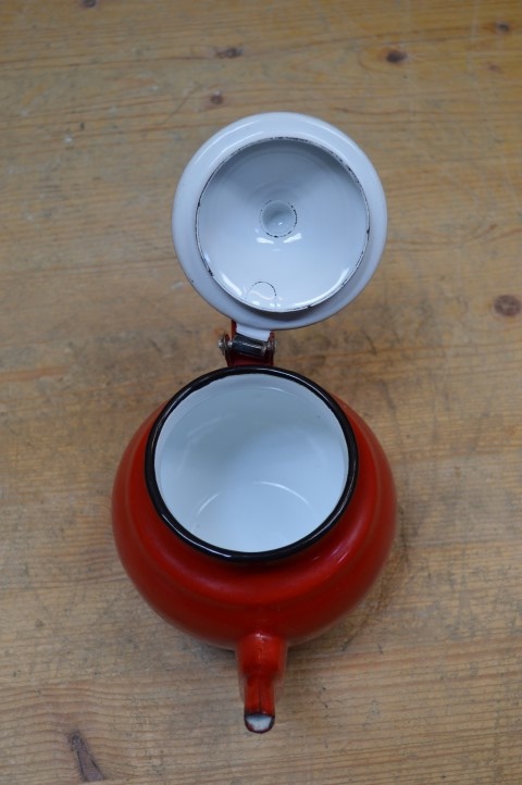 Omdat het emaille kannetje al wat ouder is zijn er enige gebruikssporen te bespeuren, maar als decoratie is deze kan nog steeds uitstekend te gebruiken.