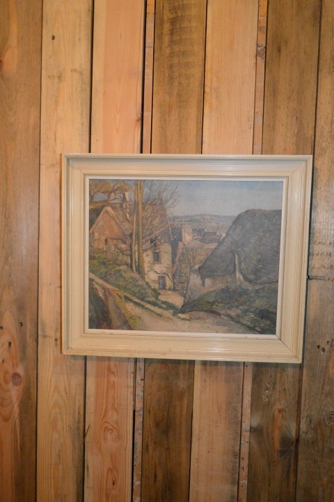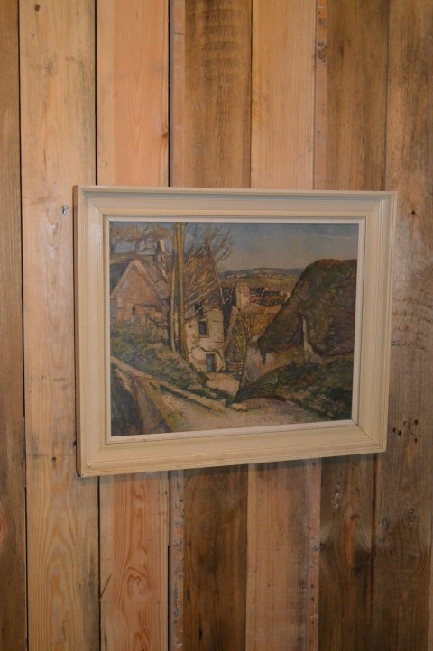Rustiek landschap op linnen geschilderd in een retro lijst. Mooie voorstelling van een landschap uit de Ardennen of het platteland van Frankrijk. Hoewel er een naam op de lijst van het schilderij staat, is de schilder bij ons onbekend.