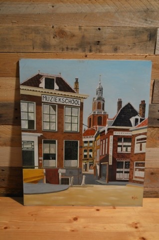 Wat een sfeervolle vondst! Dit schilderij De Muziekschool van kunstschilder M. Stolk neemt u mee naar een levendige muziekschool aan de gracht, midden in een historische stad. De warme kleuren, de charmante compositie en de kenmerkende jaren-60 stijl maken dit werk bijzonder decoratief.