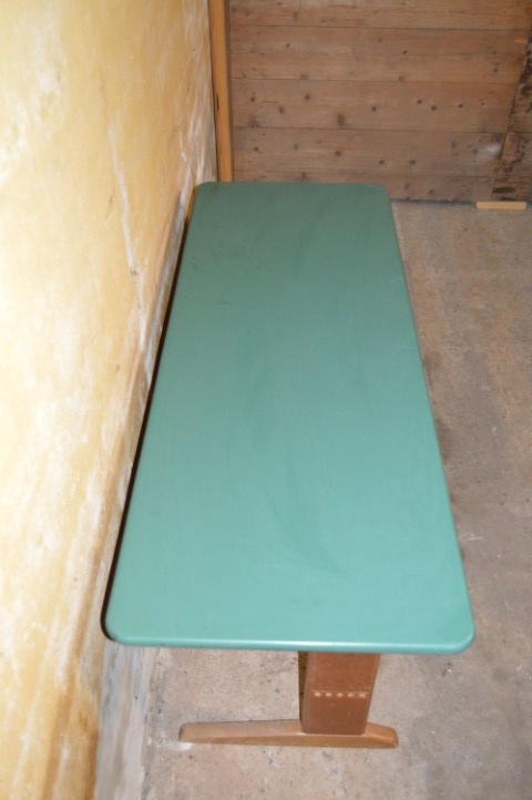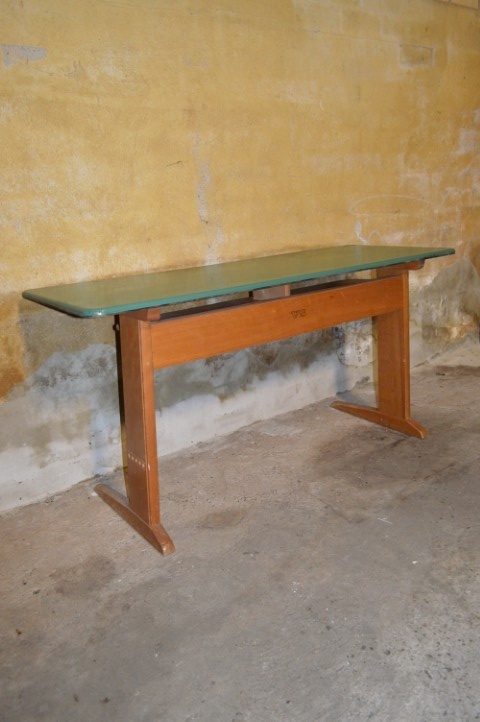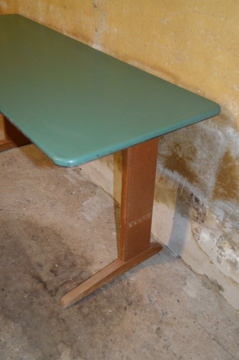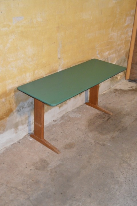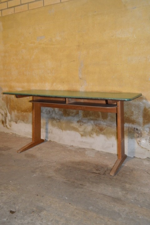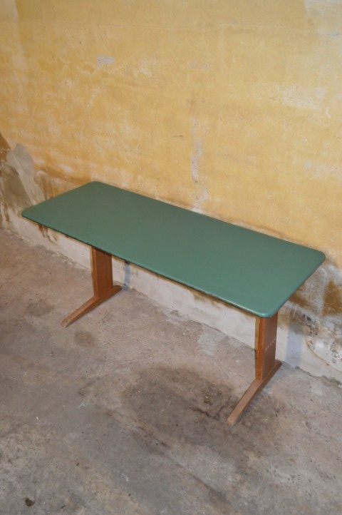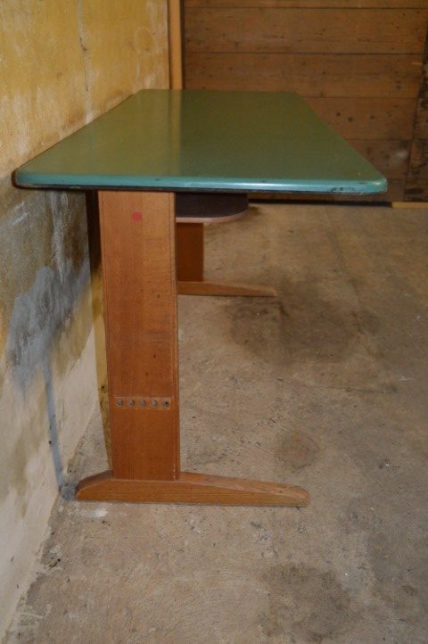 De tafel verkeert in originele staat, met normale gebruikssporen zoals krassen en lichte slijtage die bijdragen aan het authentieke karakter. Perfect voor verzamelaars van schoolmeubilair, liefhebbers van vintage design, of als charmant en functioneel meubelstuk voor thuis.
