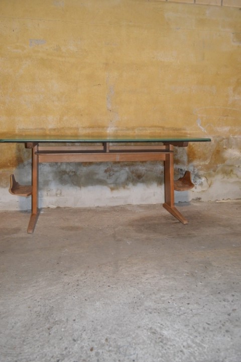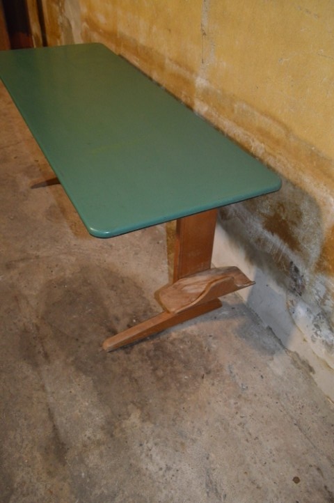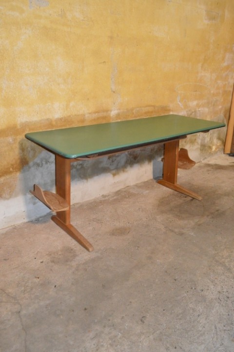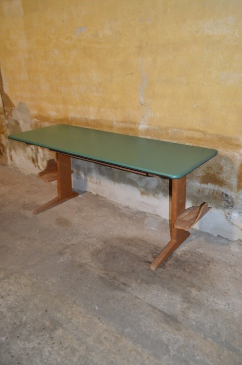 Het massief beukenhout en multiplex met hardhouten fineer zorgen voor een solide constructie, precies zoals schoolmeubilair hoort te zijn. Verwacht charmante gebruikssporen zoals krassen en slijtageplekken – helemaal passend bij zijn leeftijd en karakter. Een stoer, tijdloos en duurzaam meubelstuk dat perfect past in een kinderhoek, speelhoek, studieruimte of als stijlvol retro accent in huis.