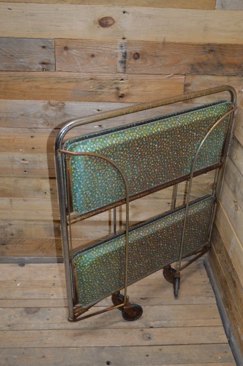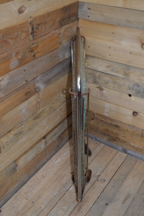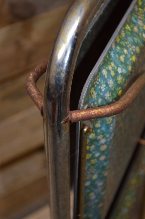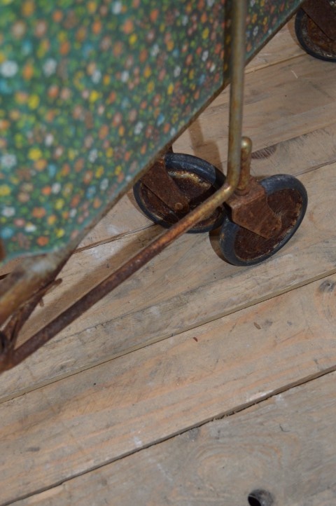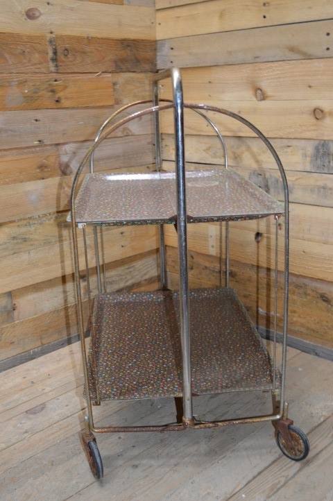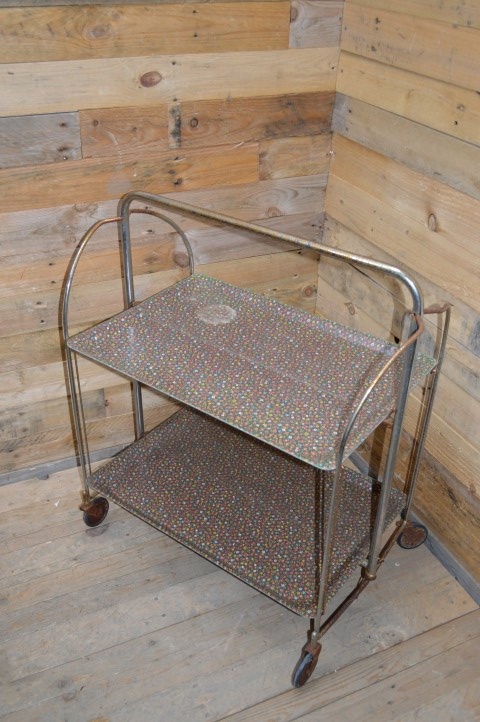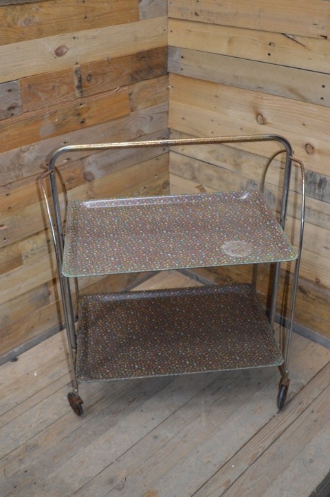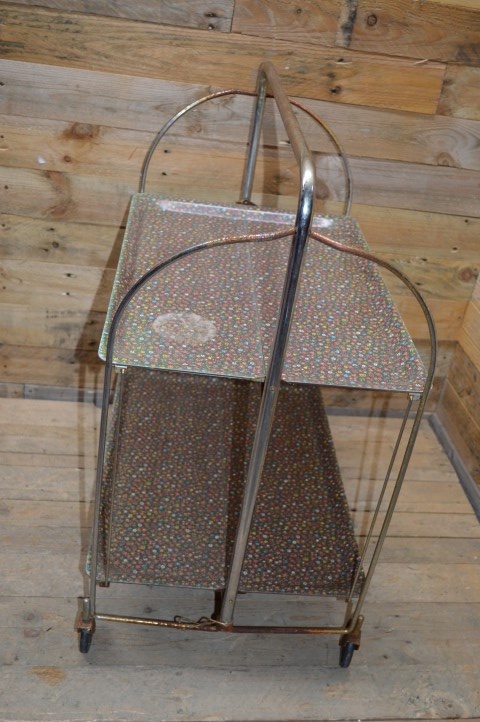Deze retro serveerboy is natuurlijk veel gebruikt en heeft gebruikssporen opgelopen. Het chroom heeft aardig wat roestplekjes. Daarnaast heeft er ooit iemand iets opgezet dat een kring heeft achtergelaten op het bovenblad. En 1 wieltje zit los waardoor deze eruit valt als je het wagentje optilt.
