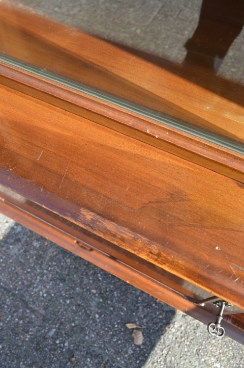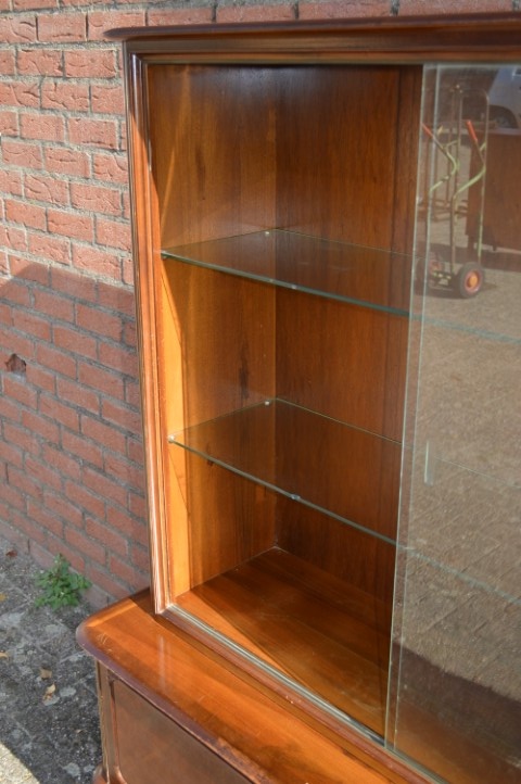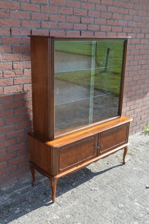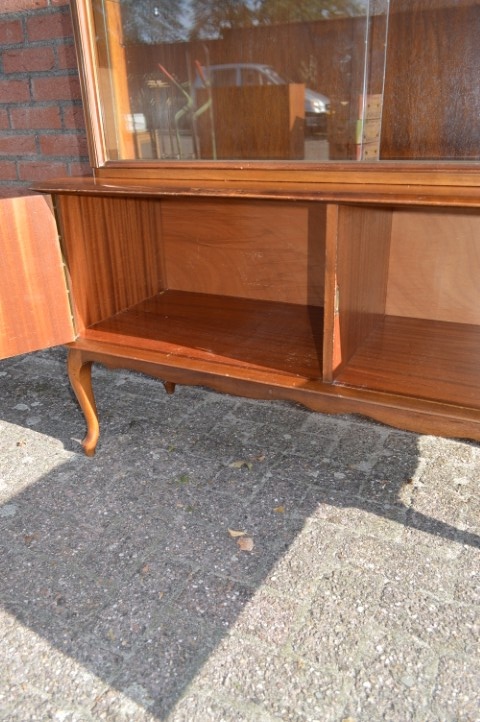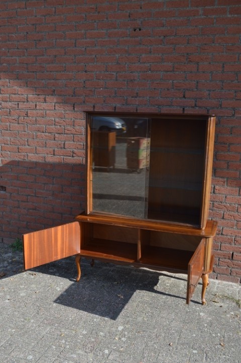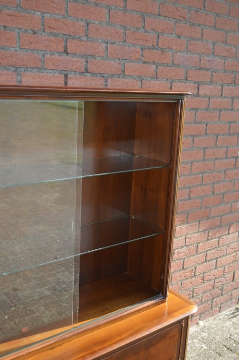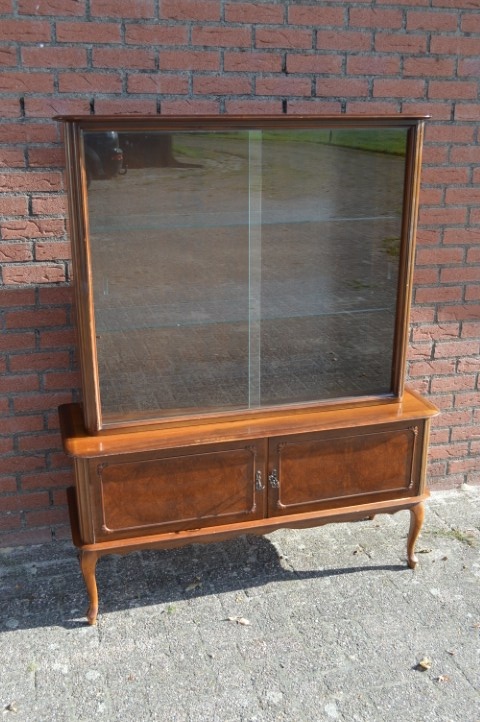 Een prachtige Queen-Ann servieskast die direct de aandacht trekt door zijn sierlijke vormgeving. Achter de glazen schuifdeurtjes komt uw mooiste theeservies of verzameling beeldjes prachtig tot zijn recht. In de onderkast is ruimte genoeg voor borden en schalen.