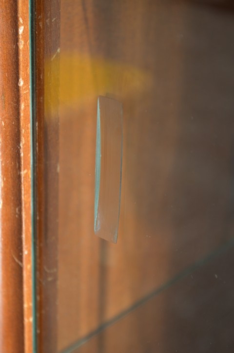 De kast is uitgevoerd in drie delen, met schuifdeuren en schappen. Zoals gebruikelijk bij een vintage meubel heeft dit exemplaar gebruikssporen: kleine beschadigingen, schilfertjes van de randen en lichte slijtages. Dit draagt echter alleen maar bij aan het karakter en de authentieke uitstraling van deze tweedehands kast.