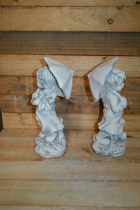 De set van twee massief betonnen beeldjes – jongen en meisje met paraplu is geschikt voor binnen en buiten. Duurzaam, weersbestendig en een echte blikvanger.