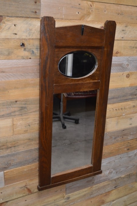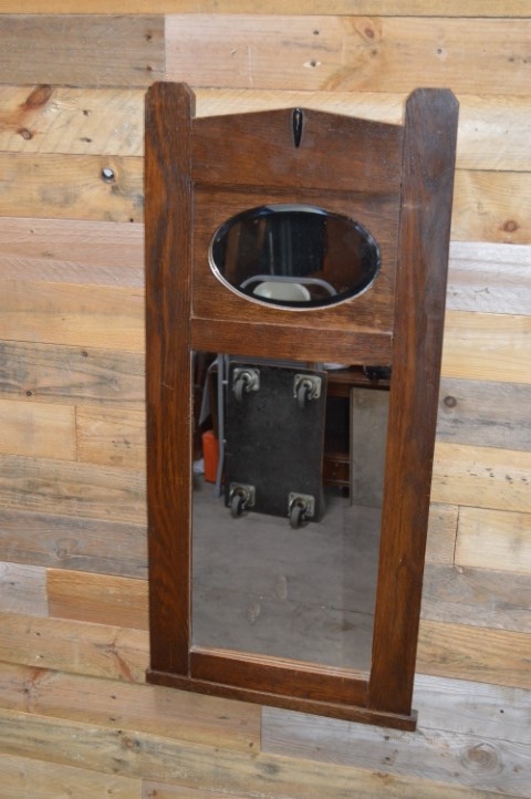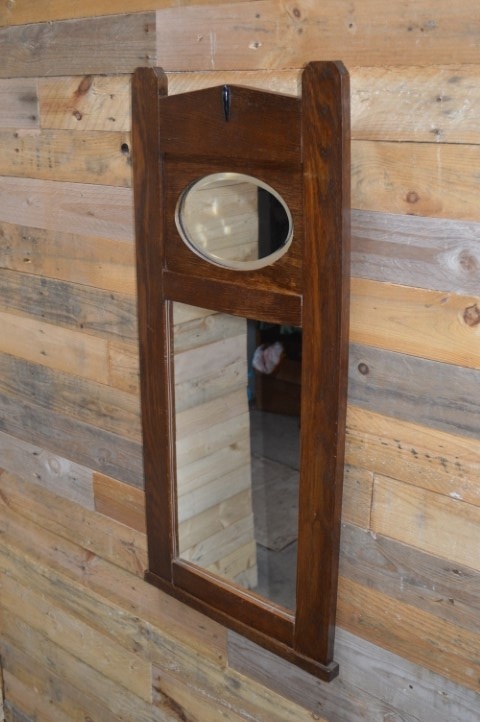Art Deco spiegel met kleine facet geslepen boven spiegel gezet in een stevige lijst van massief eiken en afgewerkt met druppel palissander. Ideaal als wandspiegel of decoratief element in huis. In de Art Deco tijd, tussen 1900 en 1940 werden dit soort spiegels vaak opgehangen om de slaapkamer of hal een wat luxere uitstraling te geven. Het is een zeer ouderwets model spiegel die wonderbaarlijk goed past in zeer modern ingerichte woningen.