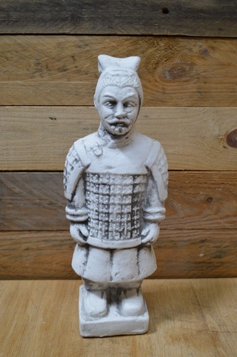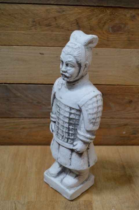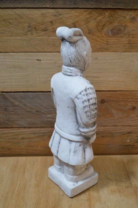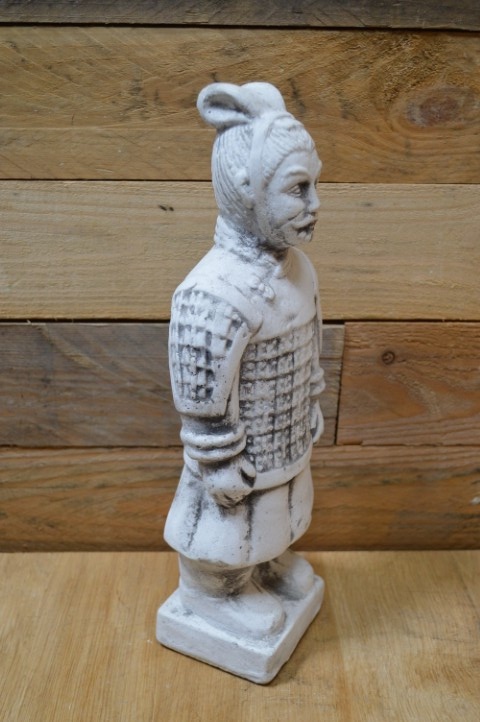 Dit Chinese soldaat tuinbeeld is een indrukwekkend betonnen beeld geïnspireerd op de beroemde krijgers uit het in China gevonden terracotta leger. Een krachtig decoratief element voor een rustige tuin, een vijverrand of als poortwachter bij een oprijlaan of entree. Wanneer u dit beeld op een sokkel of pilaar plaatst, komt het nog meer tot zijn recht. Het gaat hier om een tweede keus beeld; dat wil zeggen dat er mogelijk een klein vlekje of andere onvolkomenheid zichtbaar is. Dat maakt dit beeld echter niet minder bijzonder – het krijgt er juist karakter door. Voor liefhebbers van Oosterse tuinornamenten of decoratieve tuinbeelden met een verhaal.