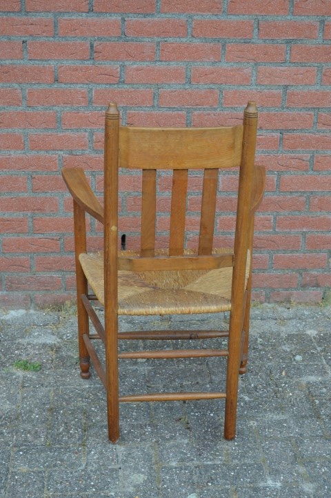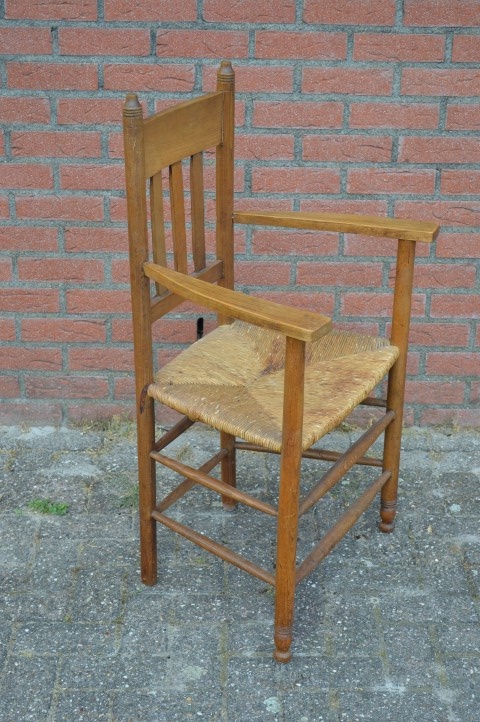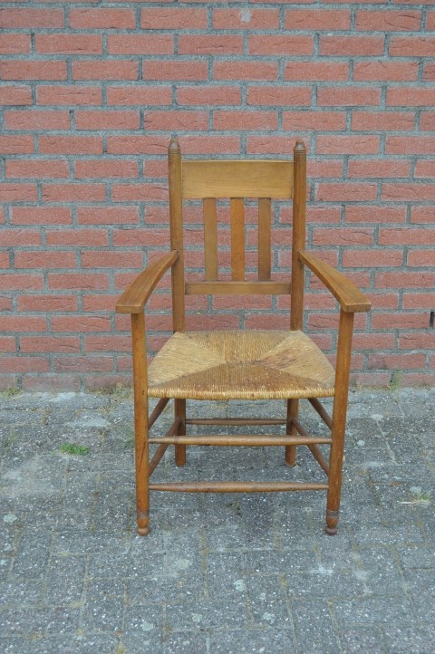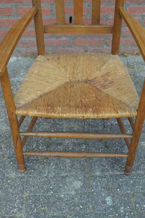 Deze brocante stoel van hout beschikt over armleuningen en biezen mat en lijkt daarmee zo uit grootmoeders tijd te komen. Schitterende tweedehands stoel die zelfs in een modern huishouden past vanwege het zitcomfort.