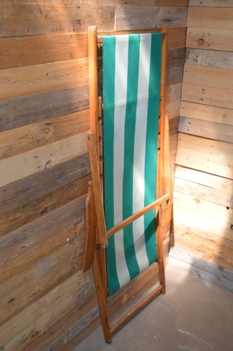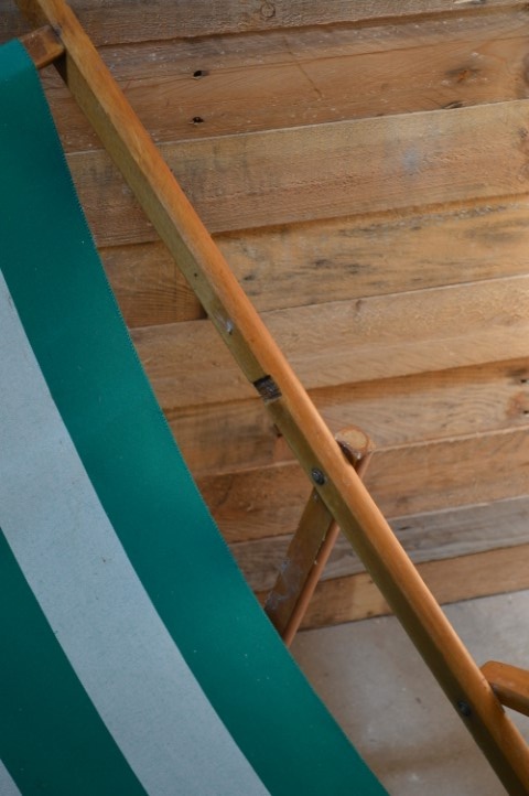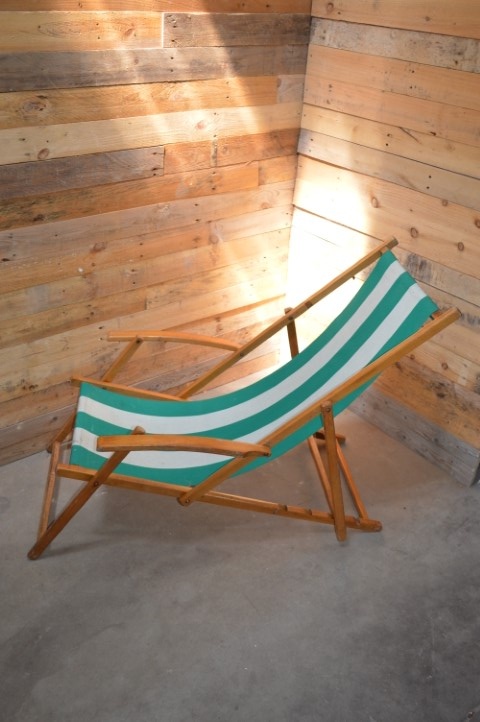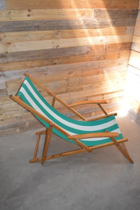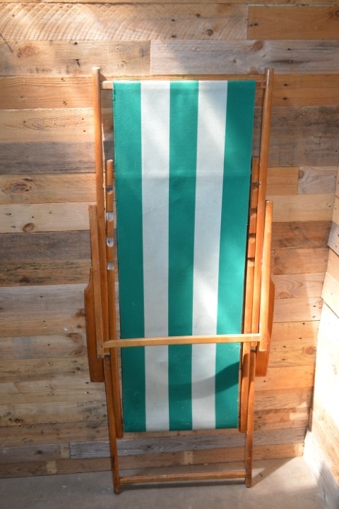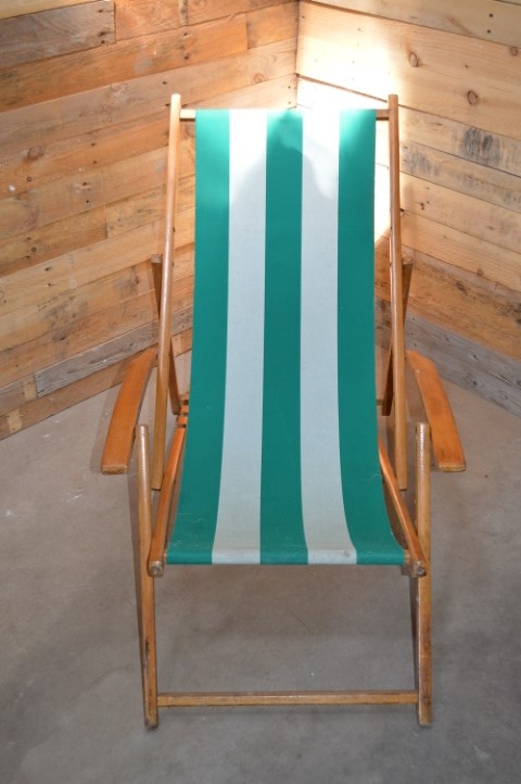 Mooie vintage beukenhouten strandstoel met groen witte strepen op het canvas doek. Heerlijke tweedehands ligstoel voor aan het water maar waarin u natuurlijk ook prima kan zonnen als u deze klapstoel op uw eigen gazon thuis openklapt.