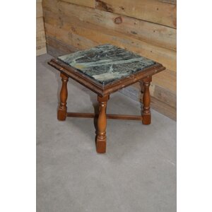 Vintage vierkant houten tafeltje met groen natuurstenen top. Een kleine accen...