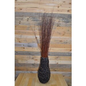 Leuke decoratieve vaas gevlochten van wilgentakken met een bos takken erin. Vintage decoratie materialen die nog steeds zeer attractief zijn.