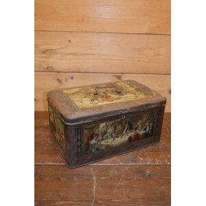 Antieke lithografische trommel van Wed. J. Bekkers uit Dordrecht rond 1920. Romantische winterse taferelen, gebruikt met een geleefd uiterlijk.