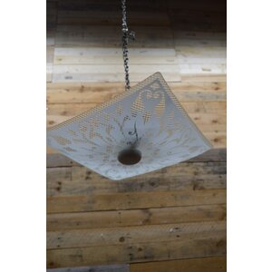 Vierkante hanglamp uit de jaren 60. Een schitterende vierkante glazen schaal van wit glas met een een soort kant getekend op het glas.
