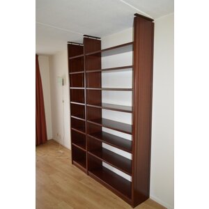Vintage boekenkast of systeem wandkast gemaakt rond 1980. De hout van de kast is bekleed met mahoniefineer. Een fantastische kast met 16 horizontale planken.