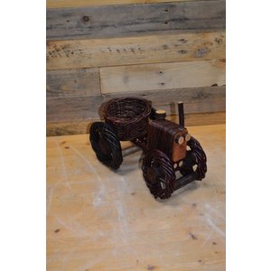 Deze kleine trekker met mandje van gevlochten wilgentenen lijkt zo van het land af te komen rijden en is erg geschikt om een bloemetje in te poten.