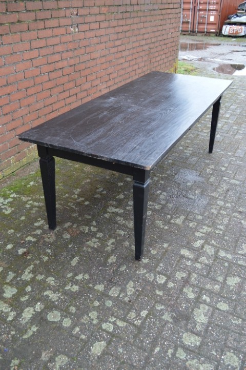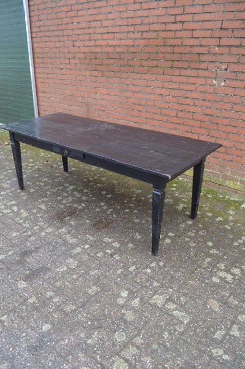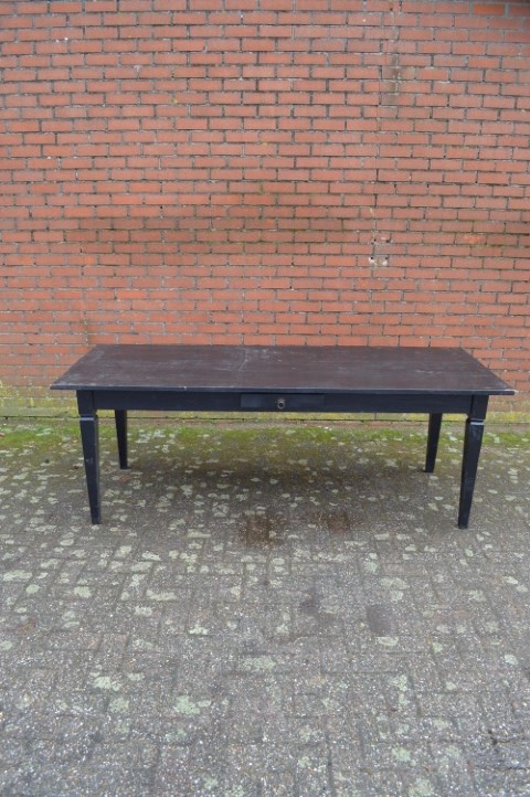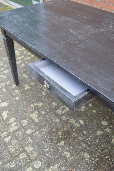 De tafel is zwart geschilderd en staat op taps toelopende poten. In het midden bevindt zich een lade, wat zorgt voor een speels en praktisch detail. Dankzij het tijdloze ontwerp past deze tafel zowel in een modern als in een klassiek interieur.