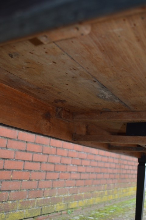 De tafel heeft gebruikssporen die passen bij de leeftijd en stijl. De poten zitten vast en kunnen niet gedemonteerd worden. De lade klemt enigszins. Een tafel met veel flair en een doorleefde, warme uitstraling.