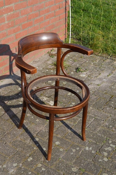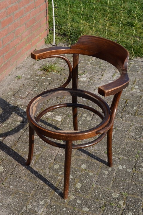Deze mooie donkere houten thonet armstoel zonder zitting is ideaal voor mensen die zoeken naar een leuke stoel om op te knappen voor in de keuken of eetkamer en het geen probleem vinden om deze stoel van een nieuwe zitting te voorzien. Dankzij de klassieke uitstraling is hij erg geschikt om te gebruiken als keukenstoel, eetkamerstoel of als extra stoel voor visite.