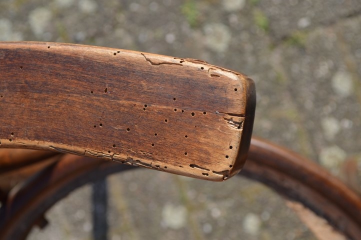 De stoel heeft gebruikssporen en is tegen houtworm behandeld.
