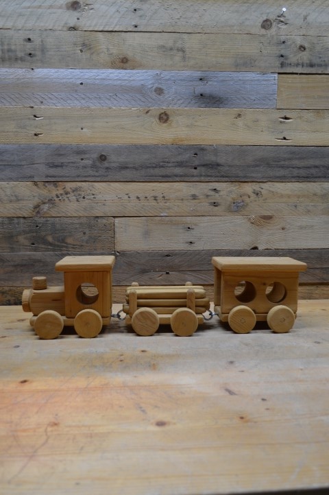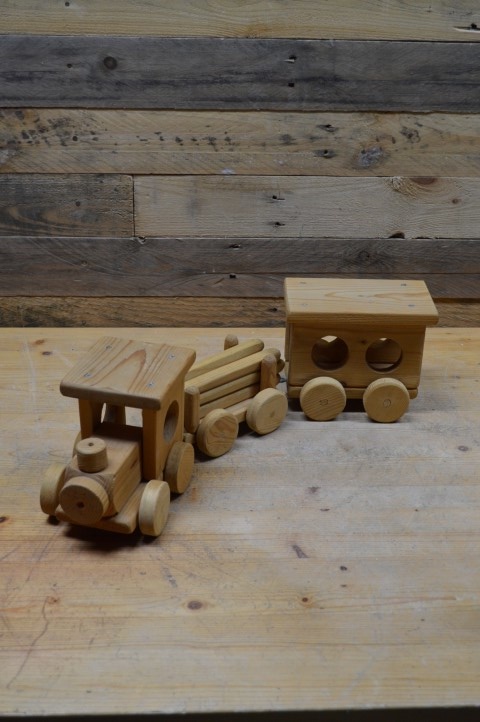 Mooie houten speeltrein met robuuste locomotief en 2 wagons van vurenhout. Deze stoere trein is ideaal voor in de speelhoek of op de kinderkamer, maar staat daarnaast ook erg leuk als decoratie op een kast of tafeltje, bijvoorbeeld als uw peuter of kleuter de trein eenmaal ontgroeid is.