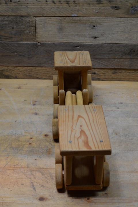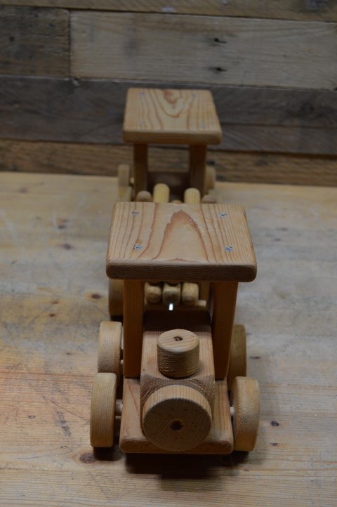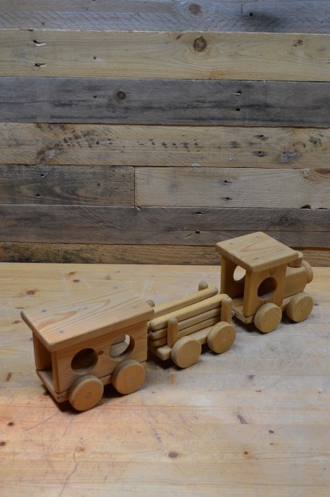 Omdat kinderen vaak niet zo zuinig zijn op hun spulletjes heeft deze oude houten trein door de jaren heen wel een aantal gebruikssporen opgelopen, maar dankzij de stevige vuren constructie die wel tegen een stootje kan is de speelgoedtrein desondanks nog steeds uitstekend te gebruiken.